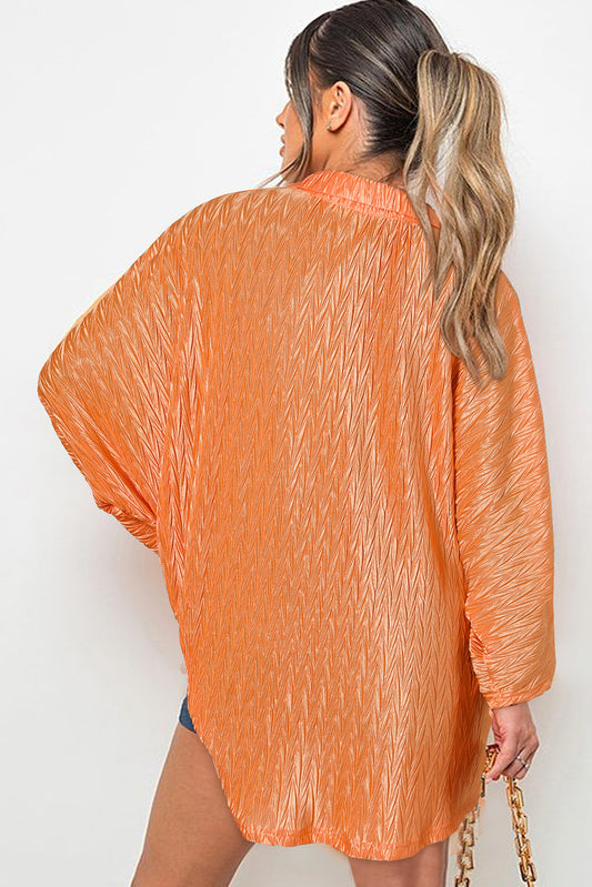 Grapefruit Orange Solid Color Crinkled Wide Sleeve Button up Shirt
