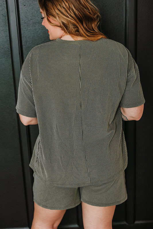 Moss Green Plus Size Rib Knit Short Sleeve Top and Shorts Set