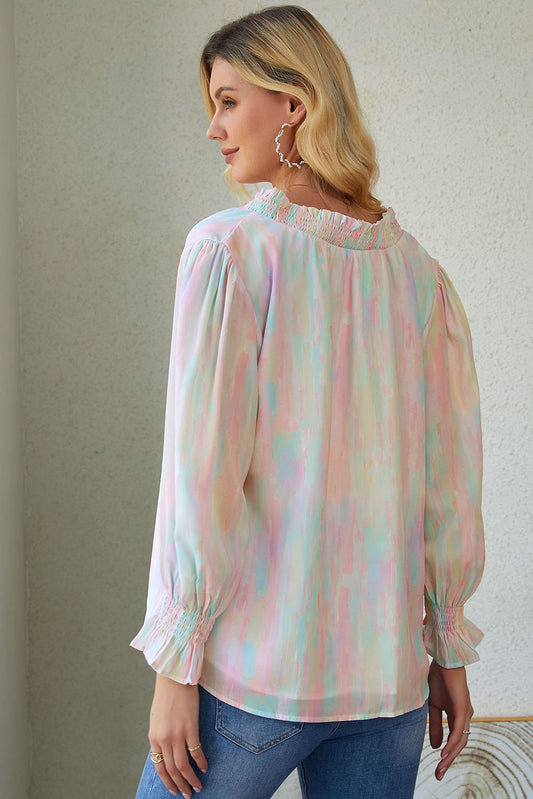 Multicolor Abstract Print Smocked Puff Sleeves Blouse