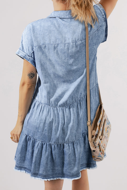 Beau Blue Mineral Wash Ruffled Short Sleeve Buttoned Denim Dress