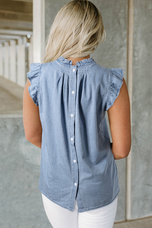 Beau Blue Button Front Ruffled Flutter Frayed Denim Top