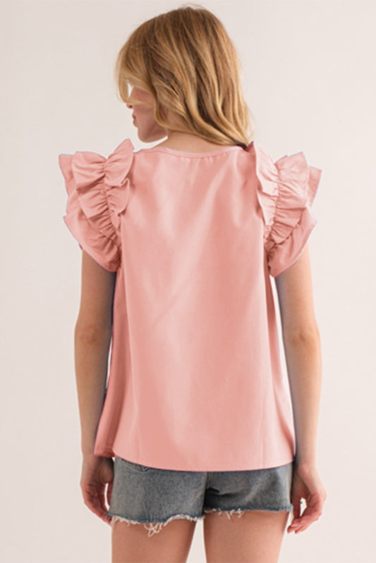 Peach Blossom Shirring Buttoned Neck Ruffle Sleeve Blouse