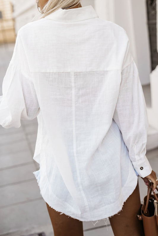 Beige Button-Up Stitching Pocket Raw Hem Shacket