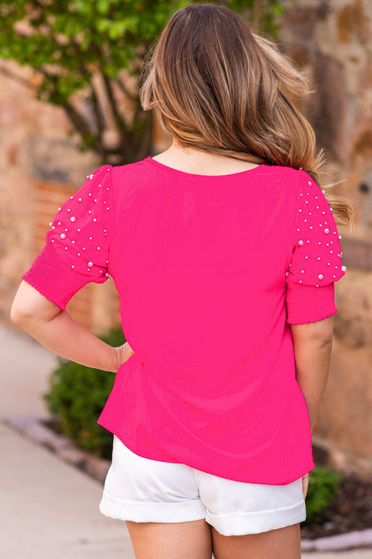 Rose Red Pearl Detail Puff Sleeve Plus Size Top