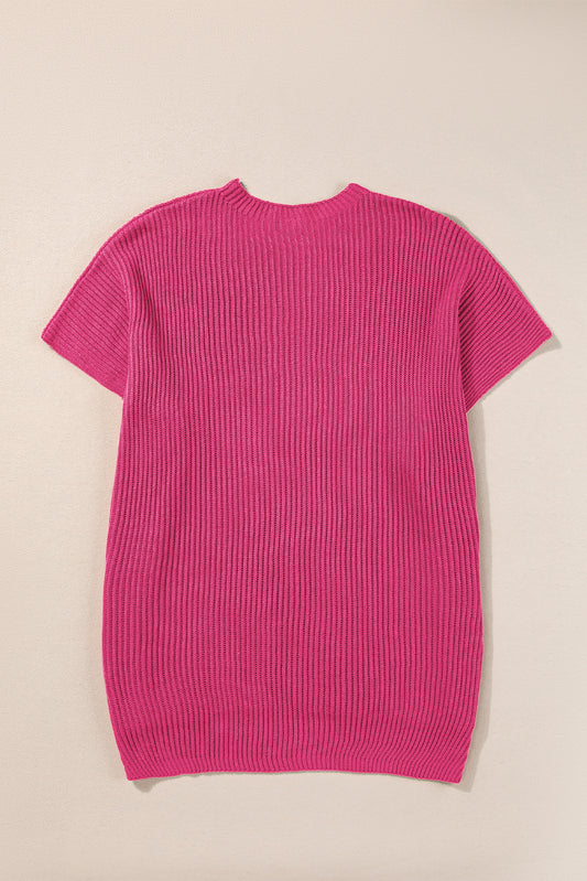 Rose Red Short Sleeve Side Slit Oversized Sweater