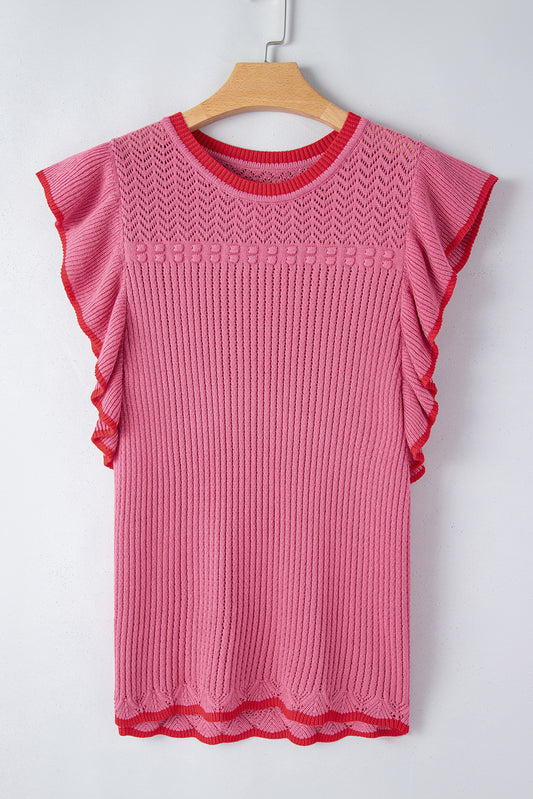 Rose Red Ruffled Contrast Trim Plus Size Short Sleeve Sweater