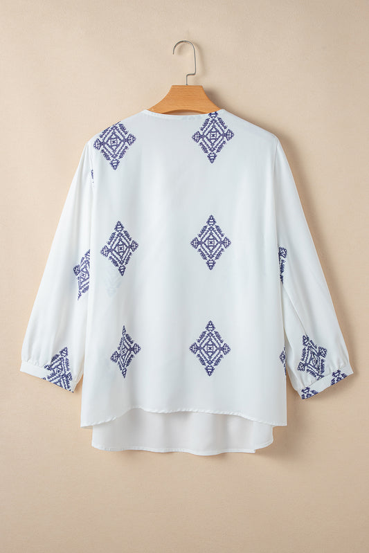 White Boho Geometric Print V Neck Bracelet Sleeve Plus Size Blouse