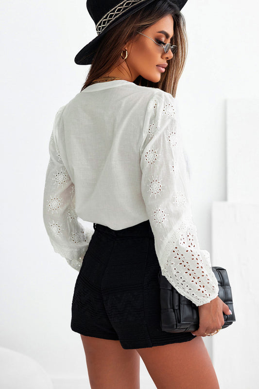 White Eyelet Lace Puff Sleeve Split Neck Blouse
