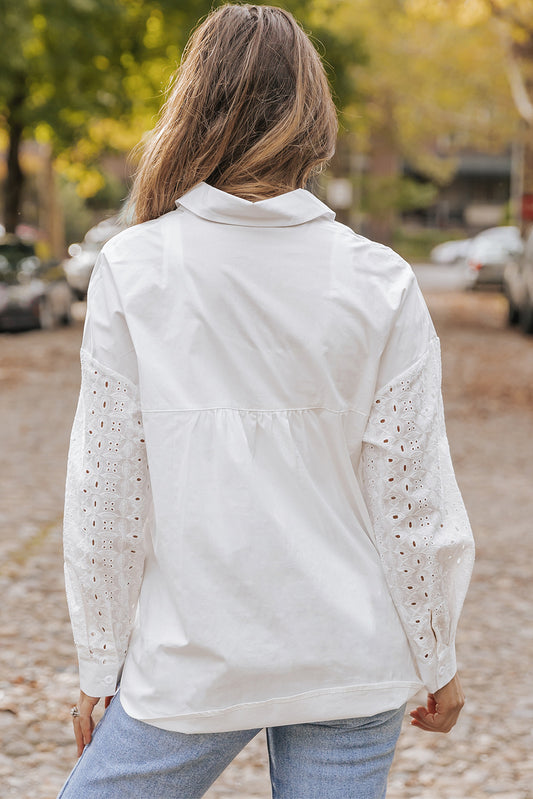 White Lace Hollow out Puff Sleeve Button up Shirt