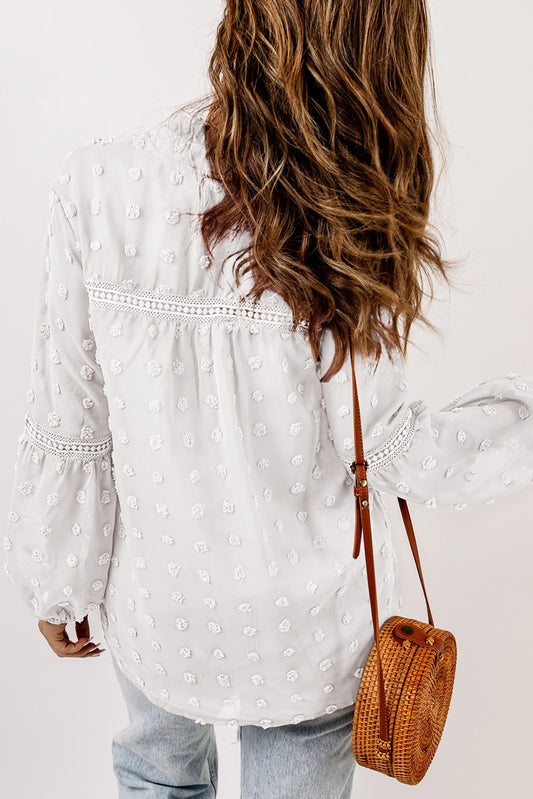 White Swiss Dot Split Neck Ruffle Babydoll Blouse