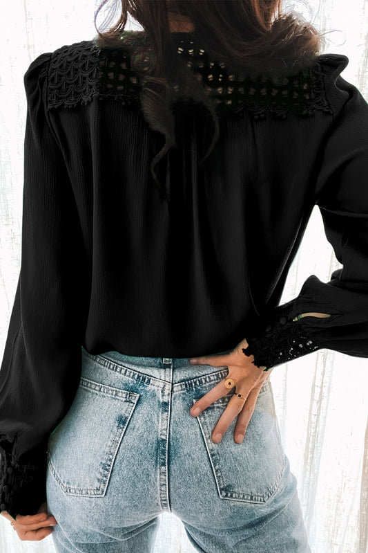 Black Crew Neck Gathered Stretch Cuff Shirt
