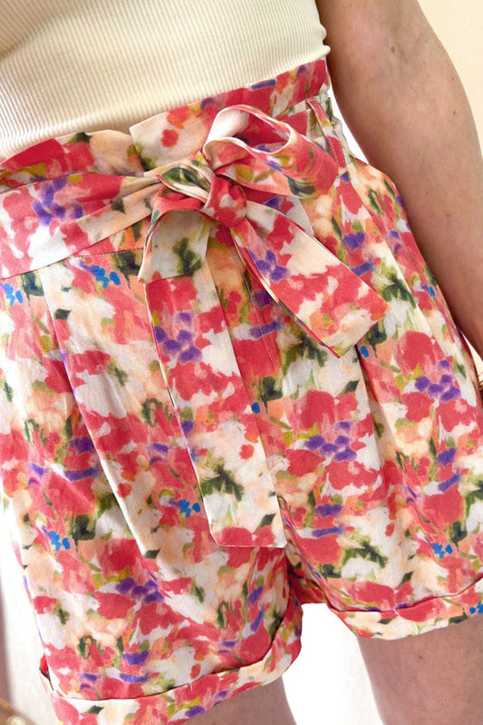 Fiery Red Abstract Floral Print Lace up High Waist Shorts