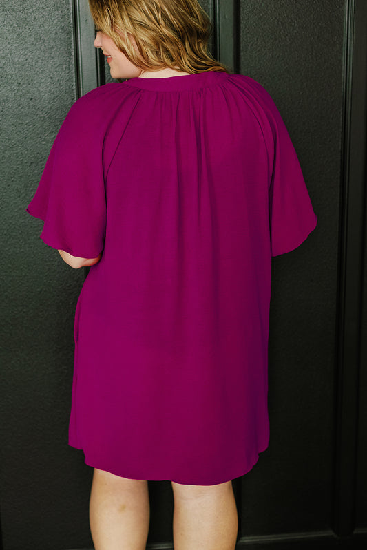 Rose Red Notched Neck Wide Sleeve Pleated Plus Size Dress