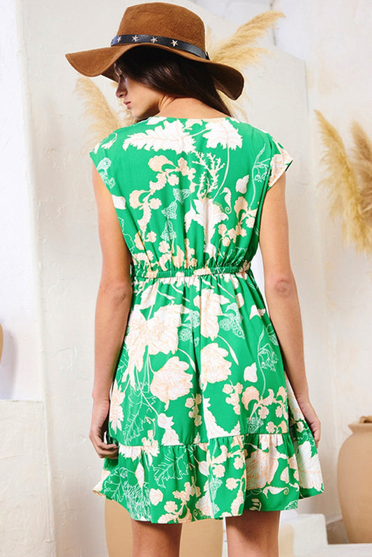 Green Floral Sleeveless V Neck Ruffled Hem Mini Dress