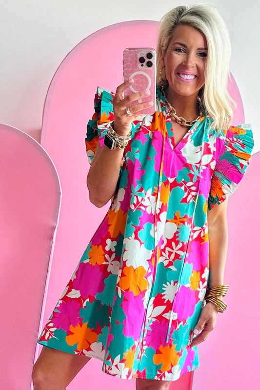 Multicolour Floral Tie Split Neck Flutter Sleeve Mini Dress