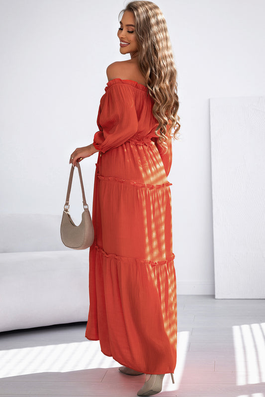 Orange Off Shoulder Balloon Sleeve Cutout Ruffled Maxi Dress