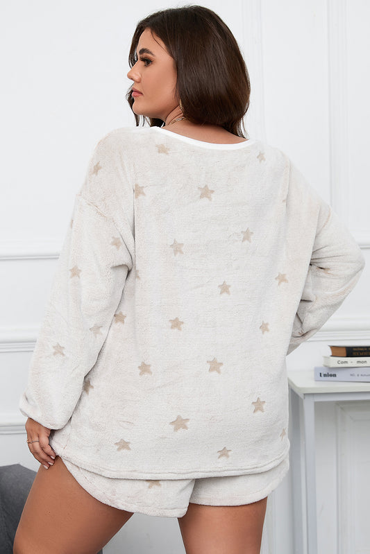 White Plus Size Plush Star Pattern Top and Shorts Set