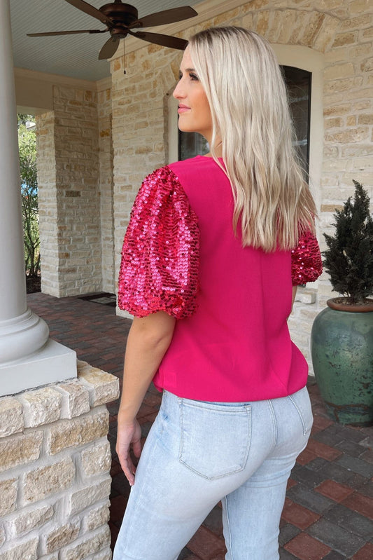 Rose Red Contrast Sequin Puff Sleeve T Shirt
