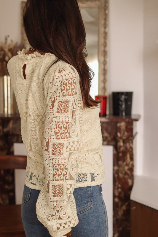 White Flower Embroidered Hollow-out Puff Sleeve Blouse