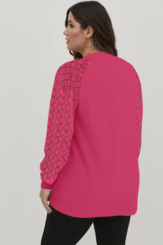 Strawberry Pink Plus Size Contrast Lace Sleeve Waffle Knit Top