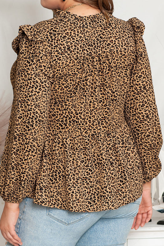 Leopard Frilled Shoulder Decor Plus Size Babydoll Top