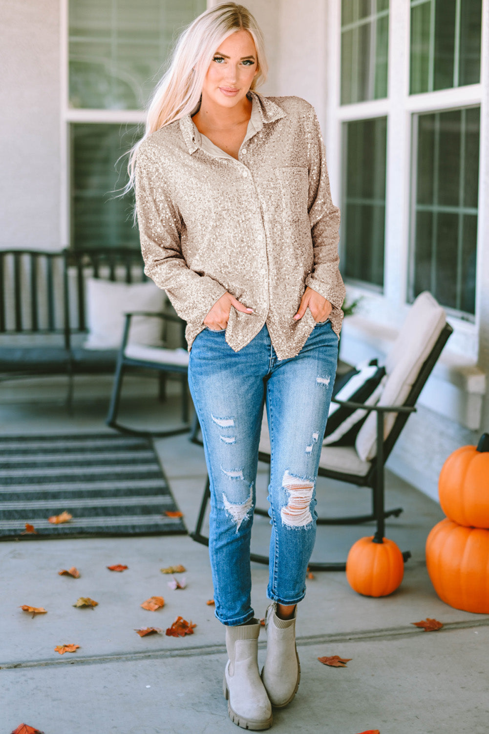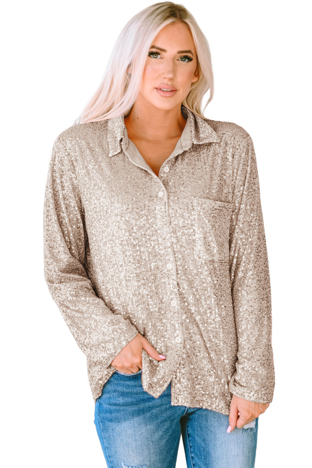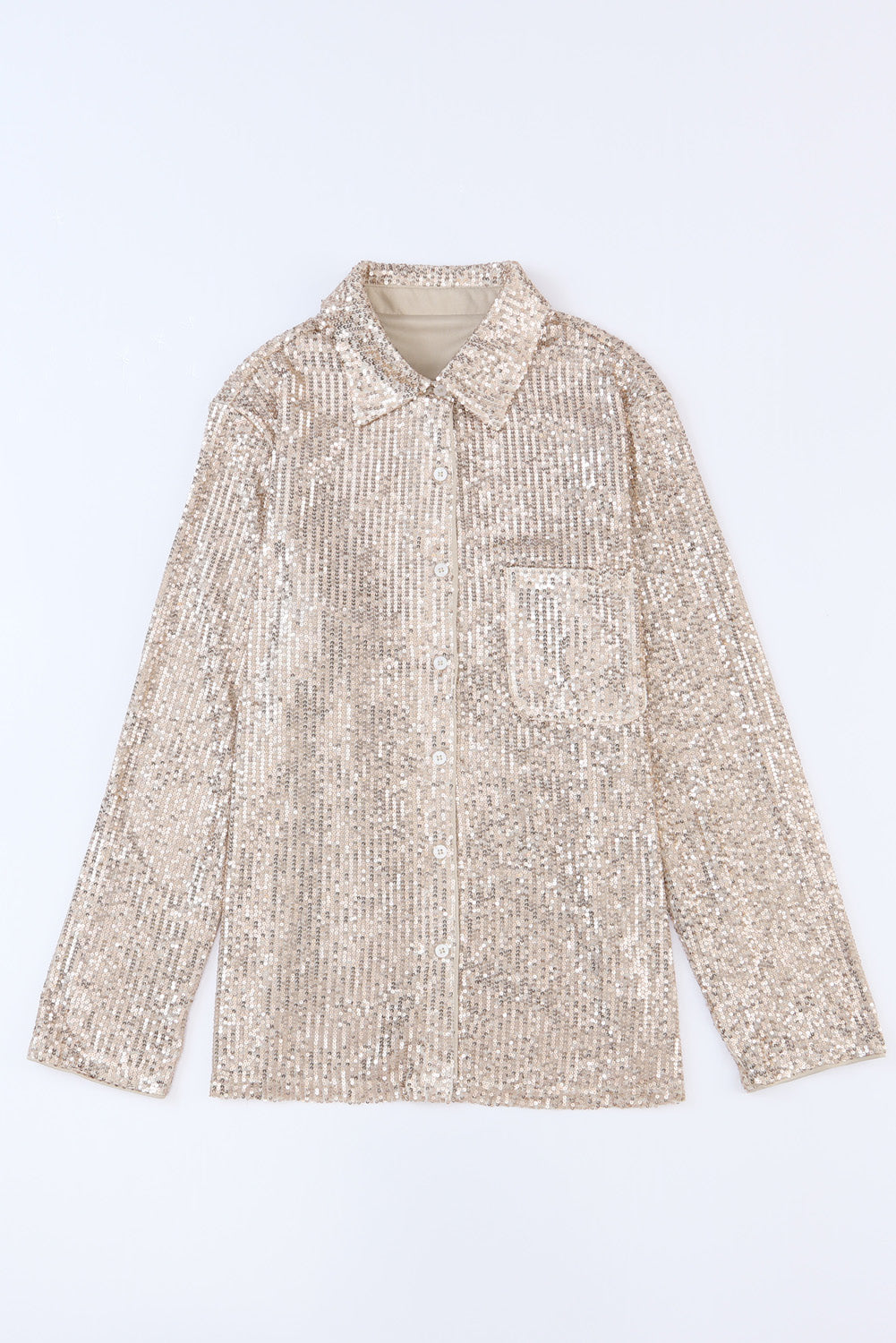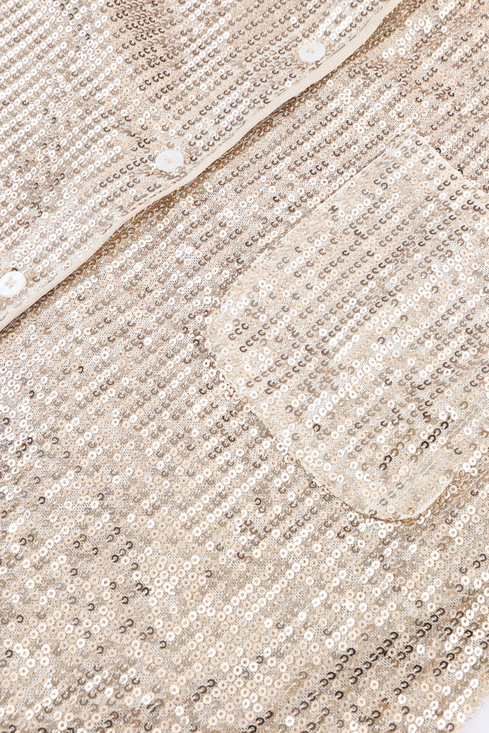 Apricot Sequin Collared Bust Pocket Buttoned Shirt