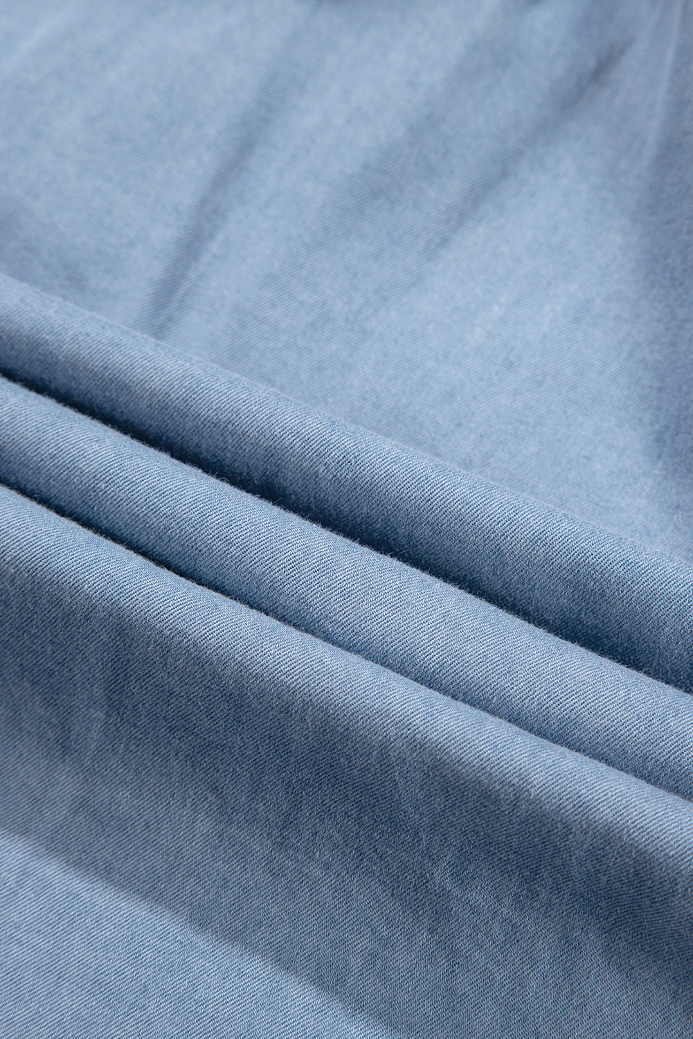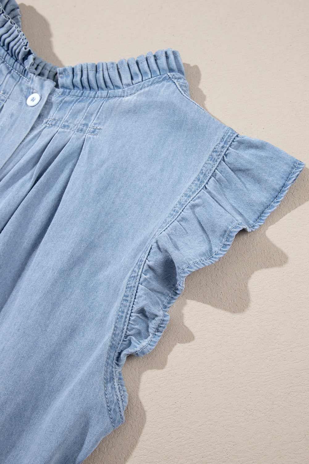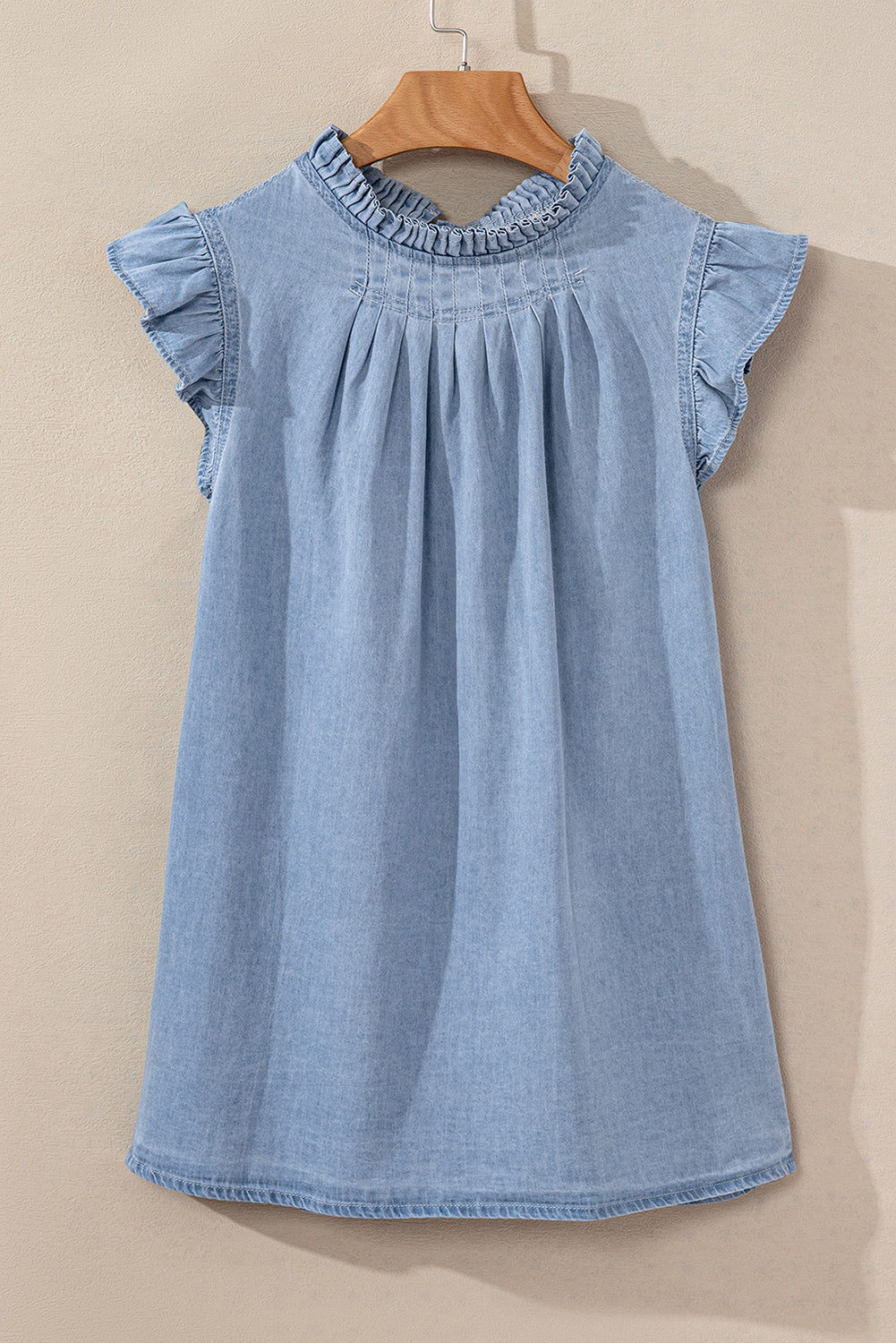 Beau Blue Frilly Pleated Button Back Retro Chambray Top