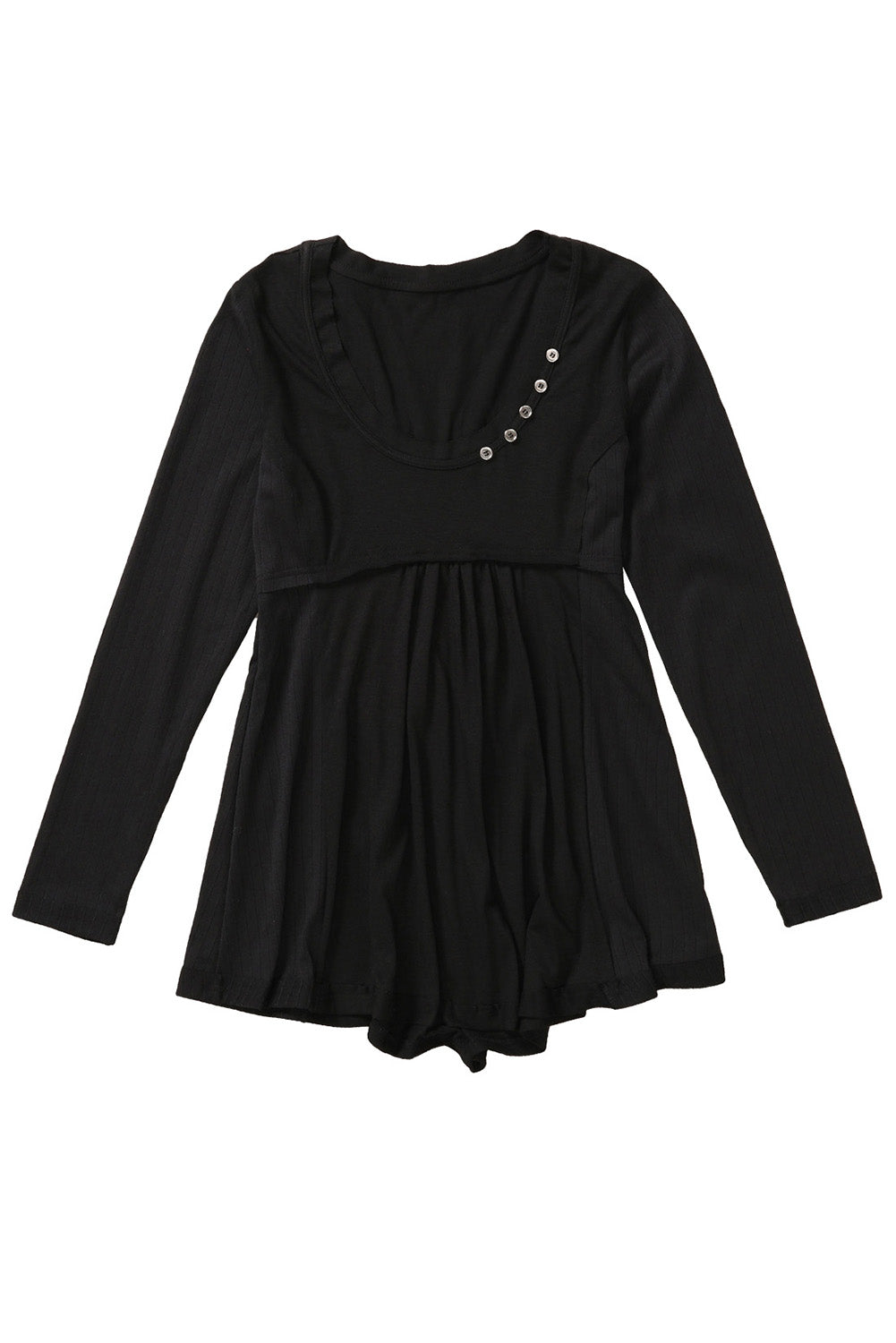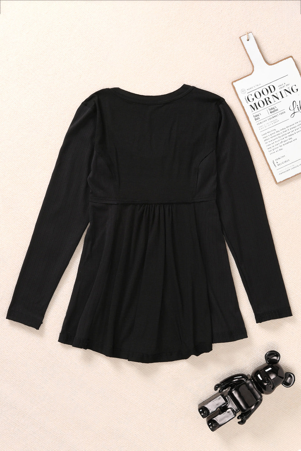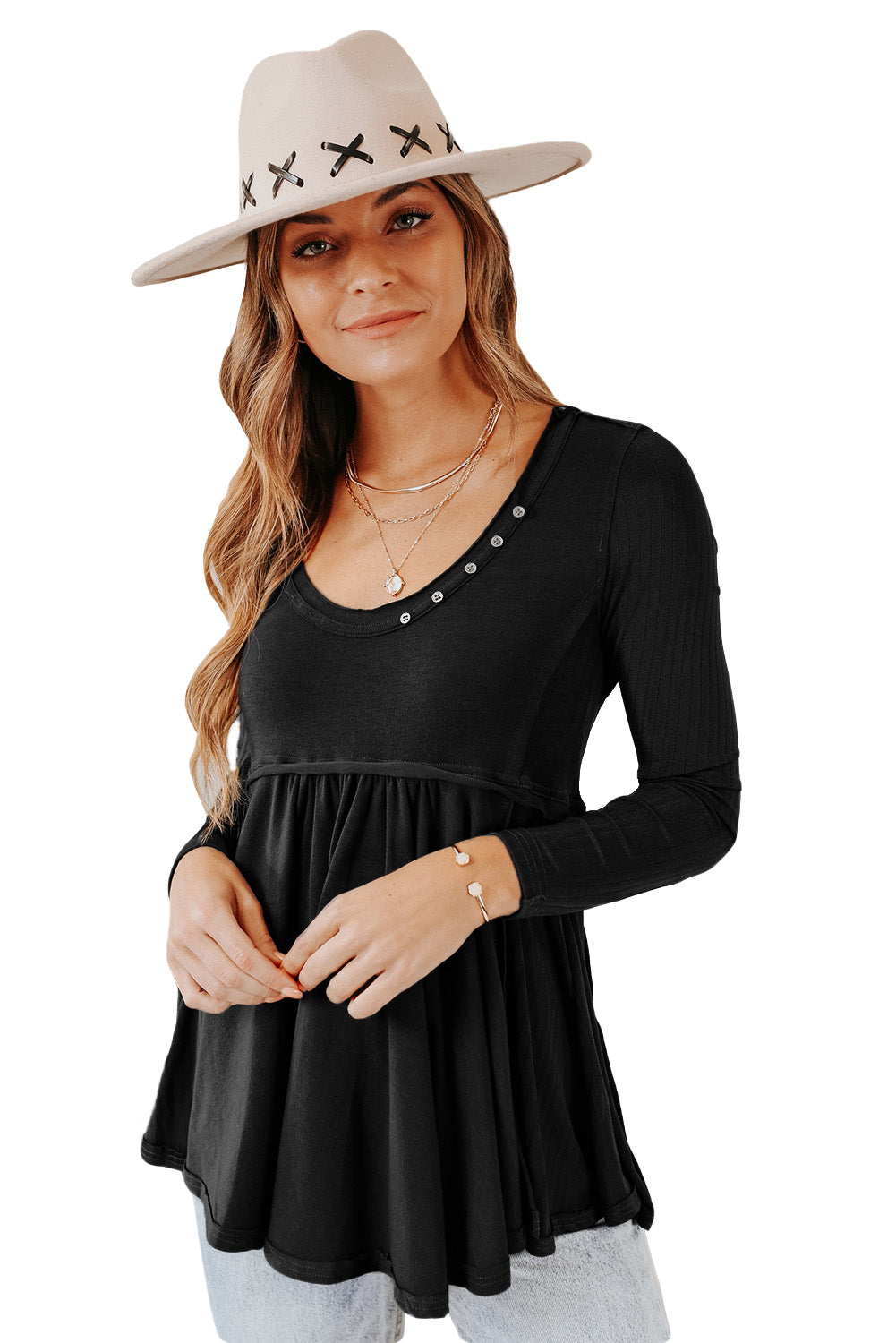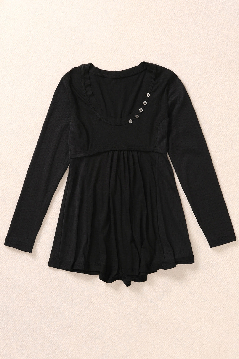 Black Solid Color Buttons Long Sleeve Babydoll Blouse