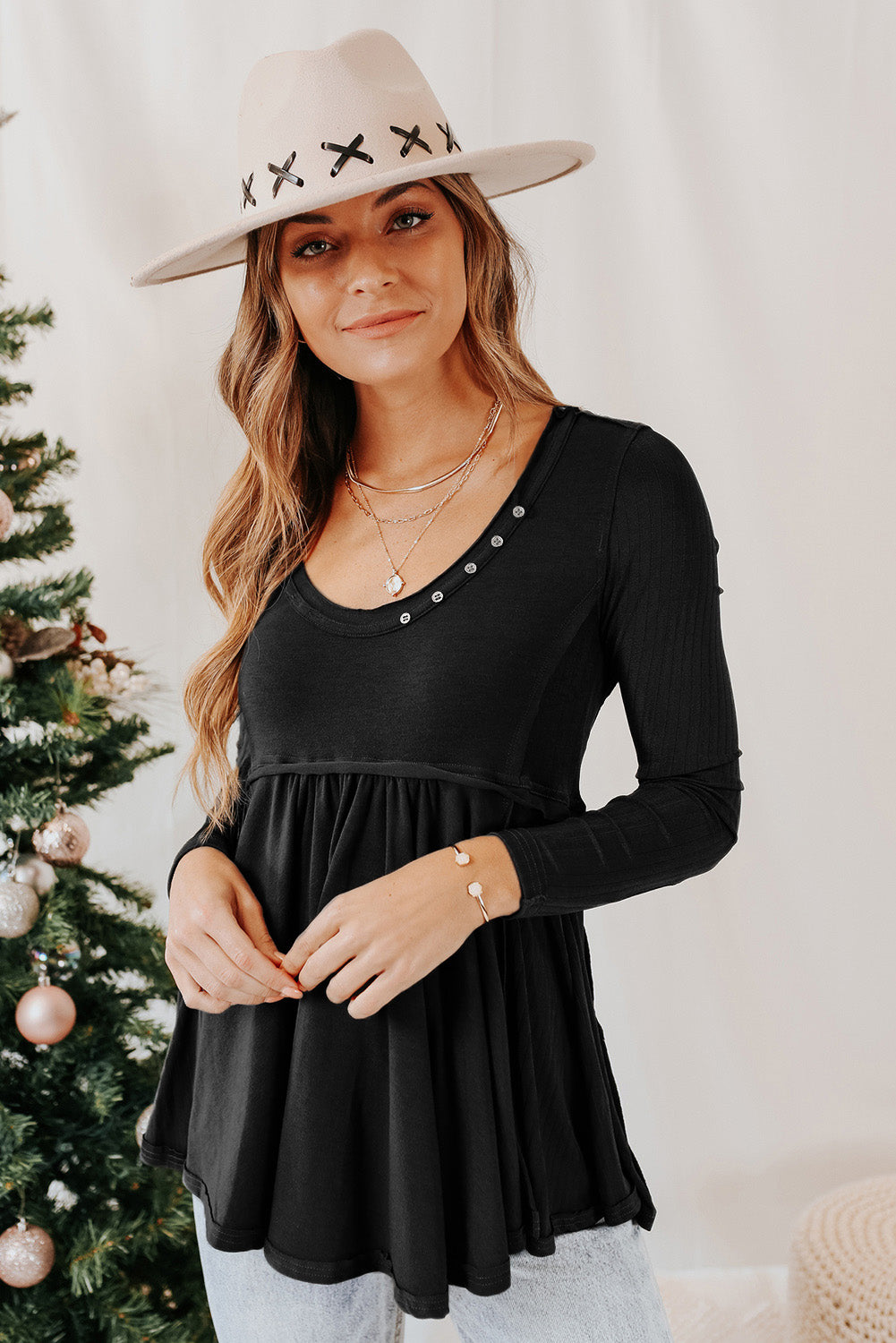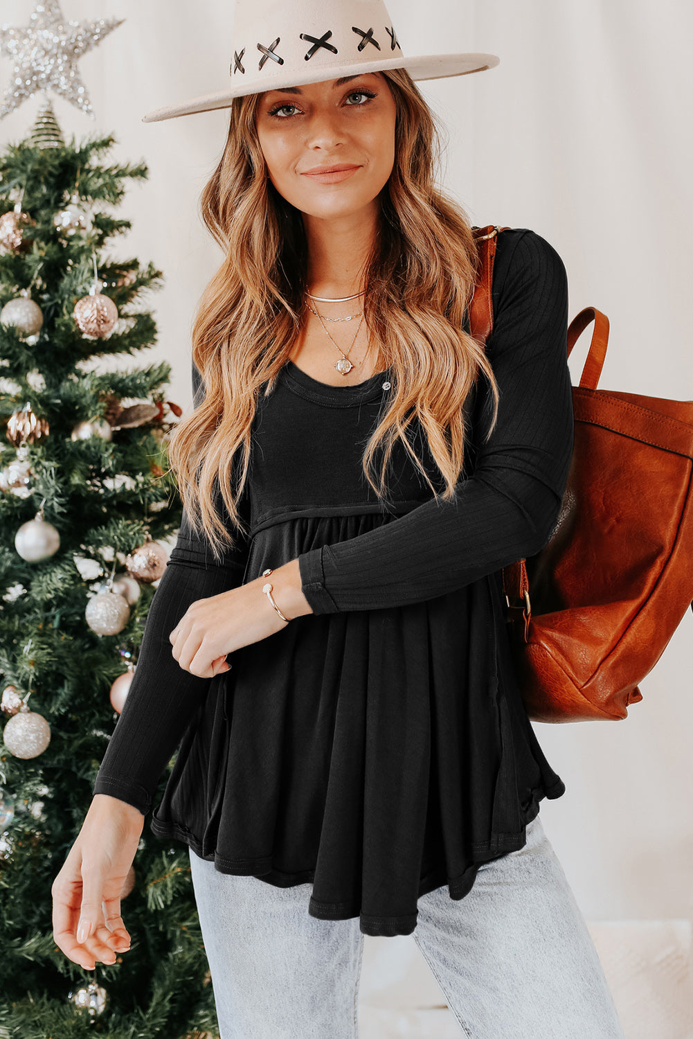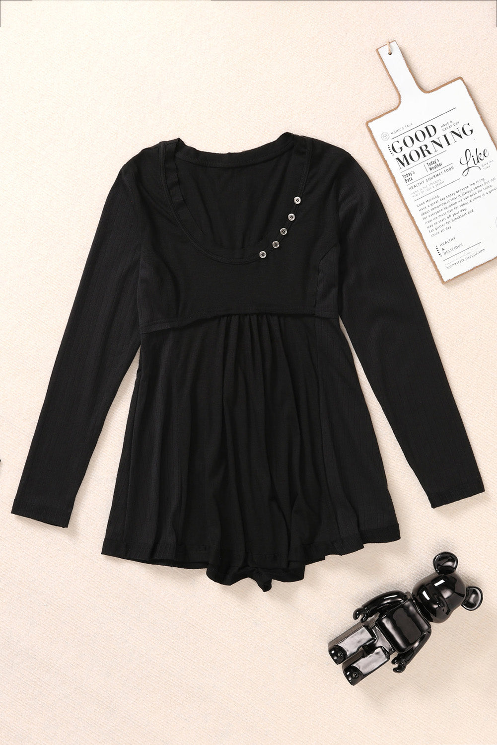 Black Solid Color Buttons Long Sleeve Babydoll Blouse
