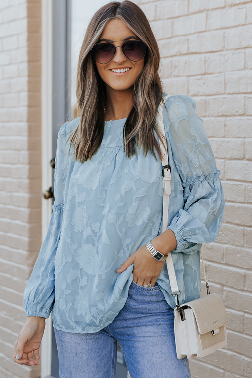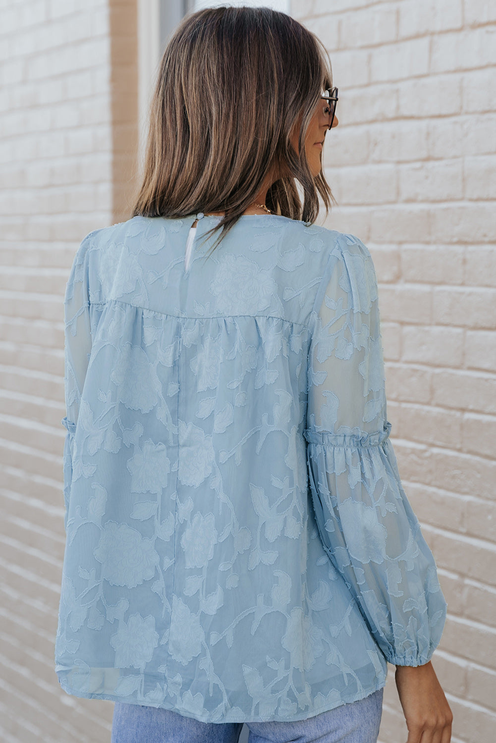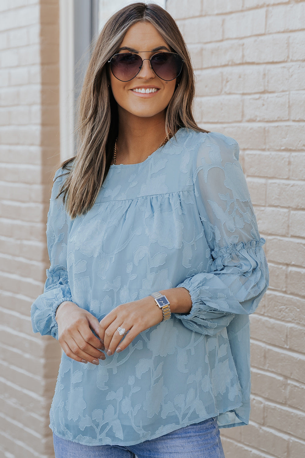 Blue Textured Ruffle Lantern Sleeve Babydoll Blouse