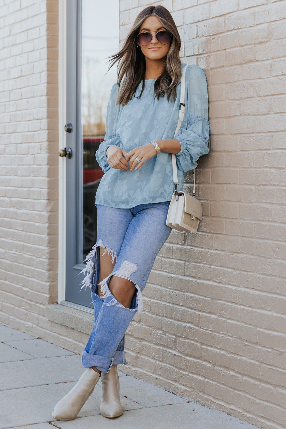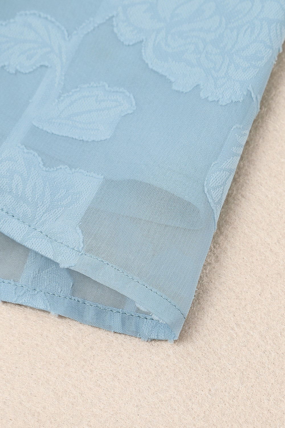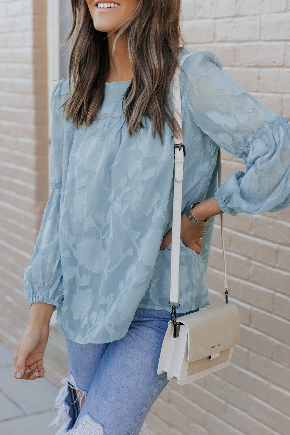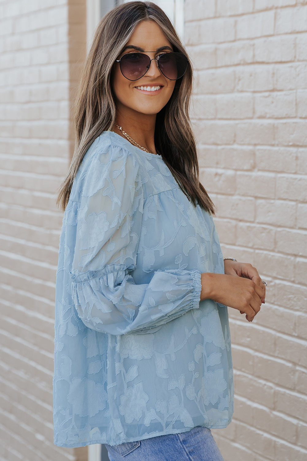 Blue Textured Ruffle Lantern Sleeve Babydoll Blouse