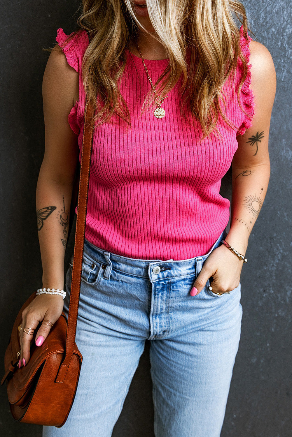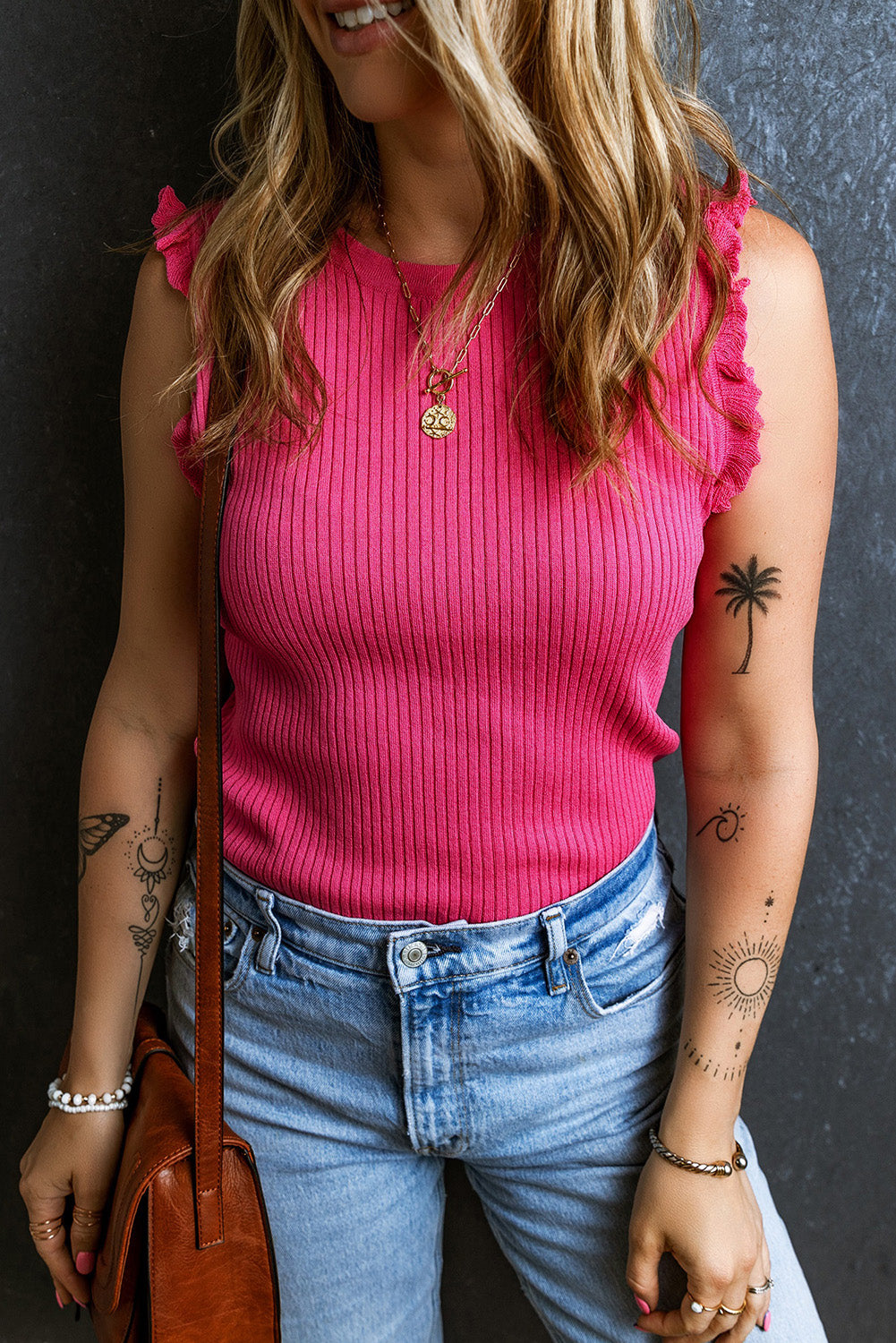 Bright Pink Ribbed Ruffled Sweater Tank