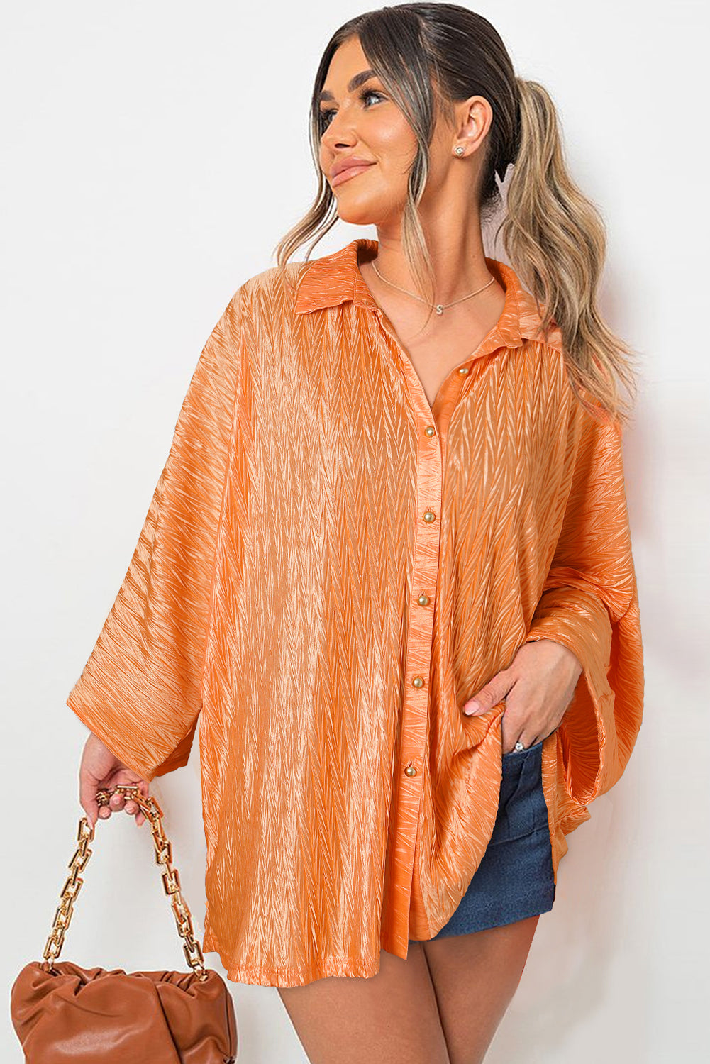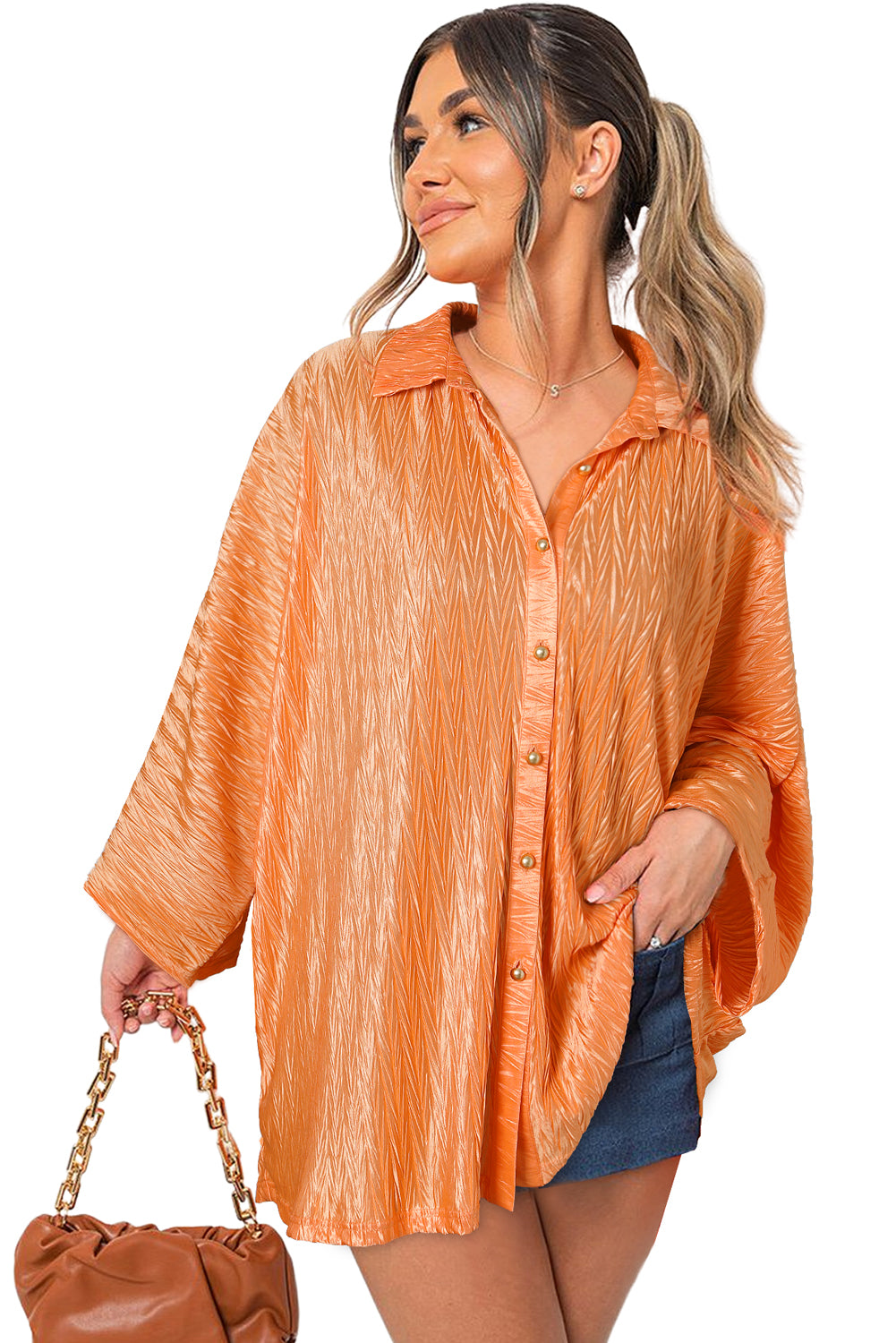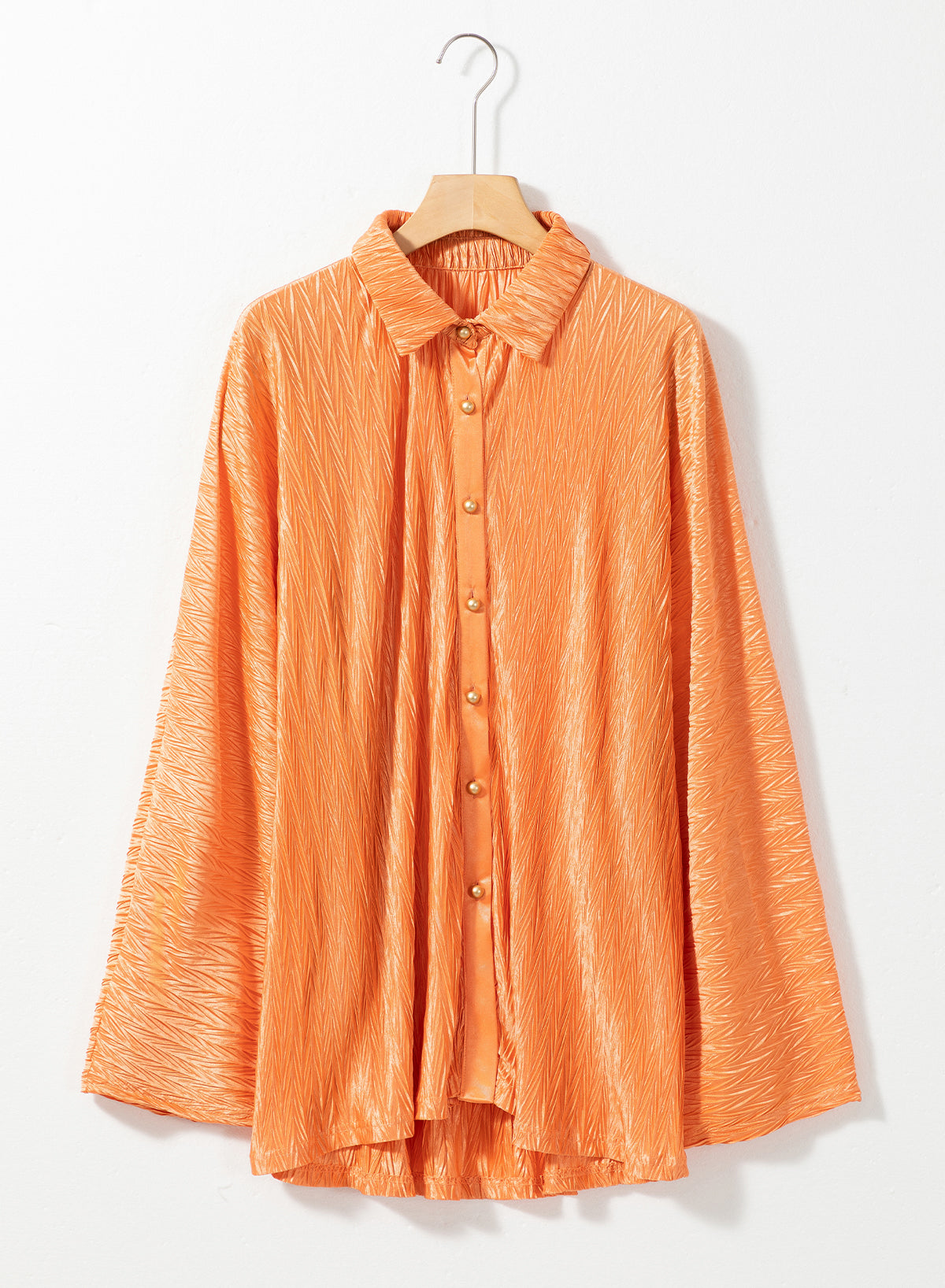 Grapefruit Orange Solid Color Crinkled Wide Sleeve Button up Shirt