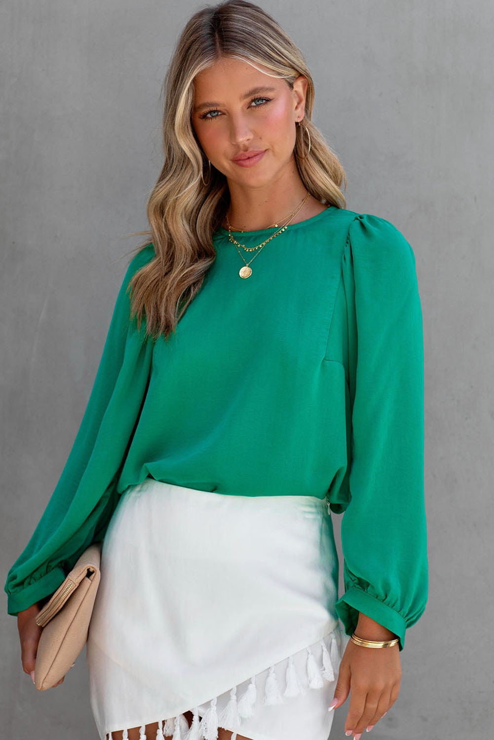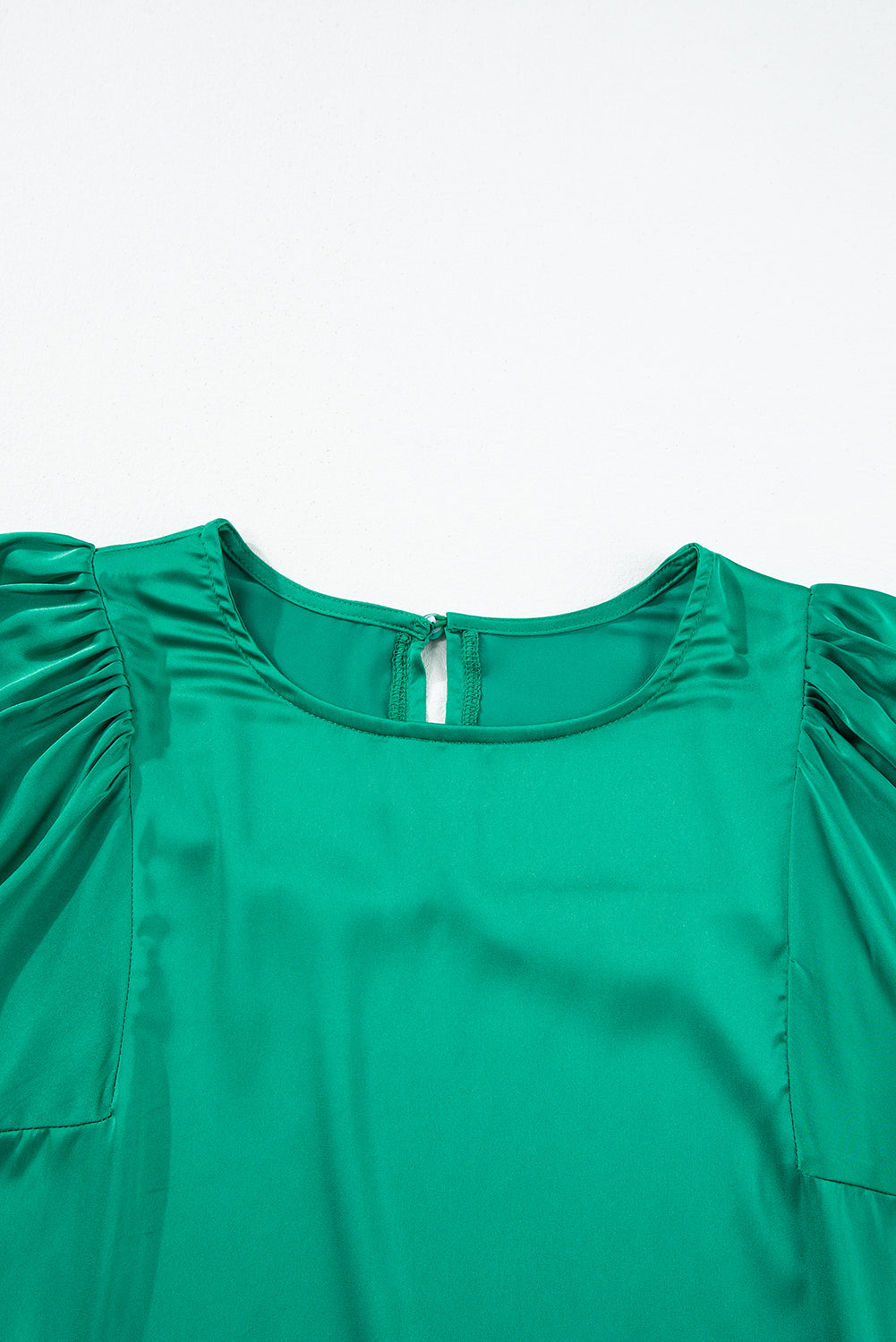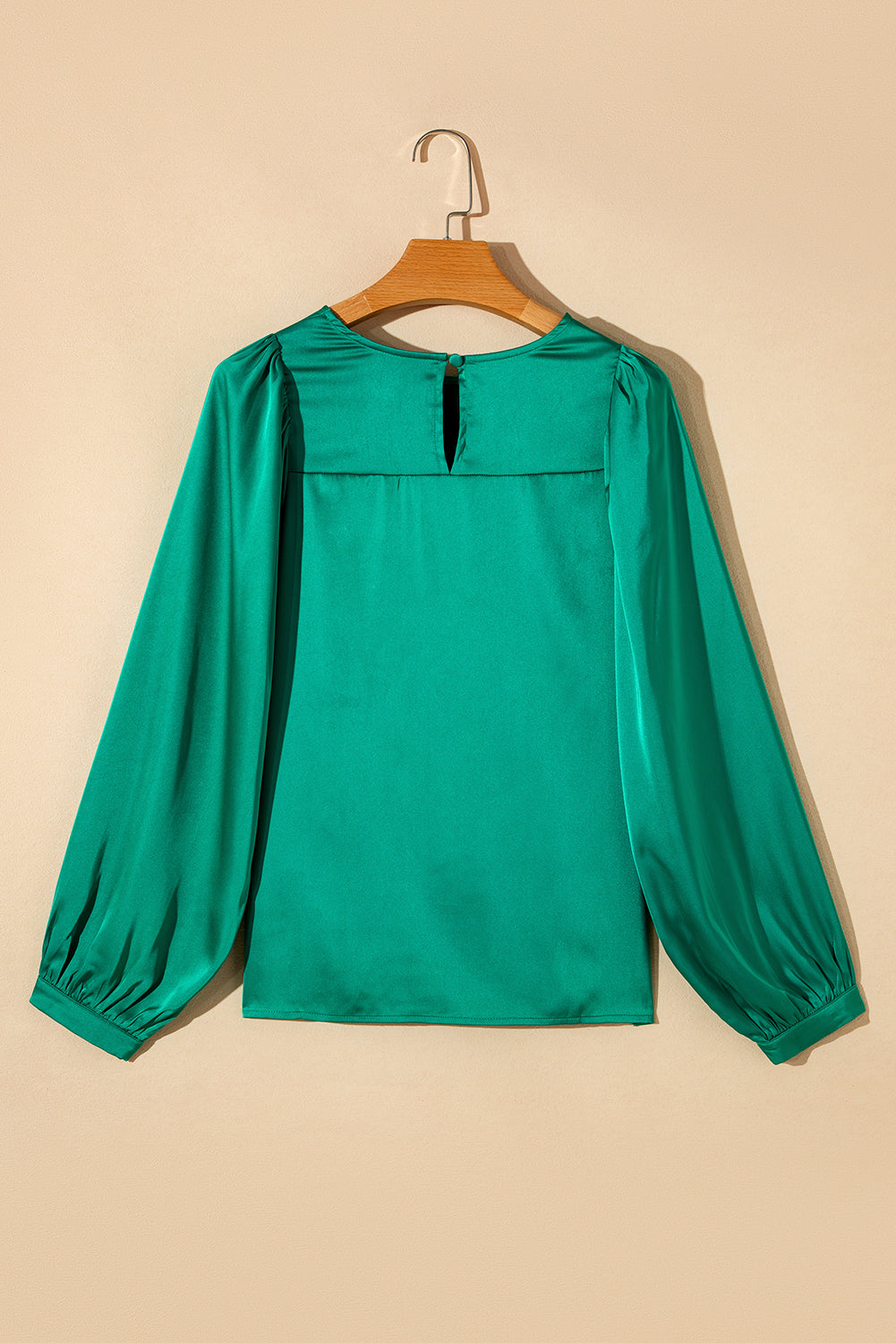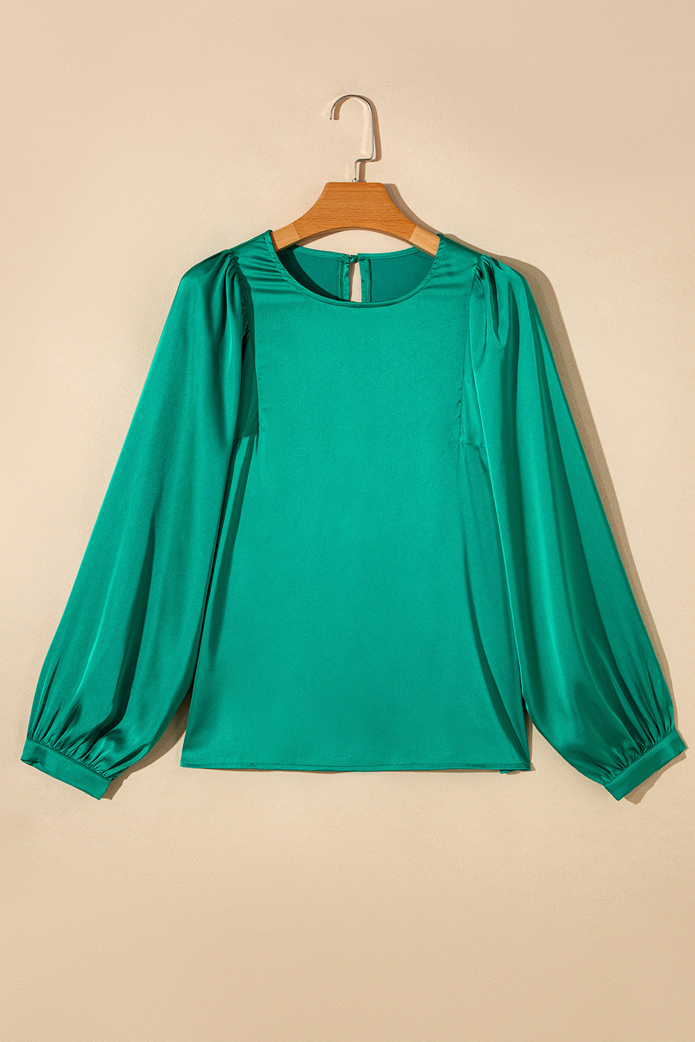 Green Satin Puff Long Sleeve Crewneck Blouse