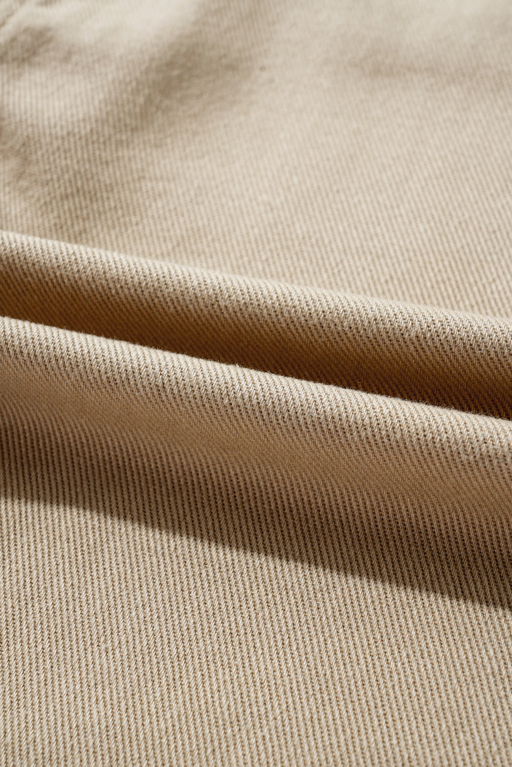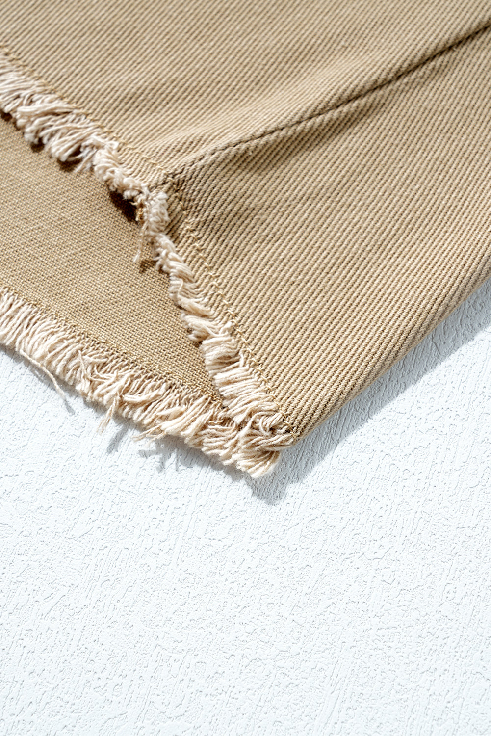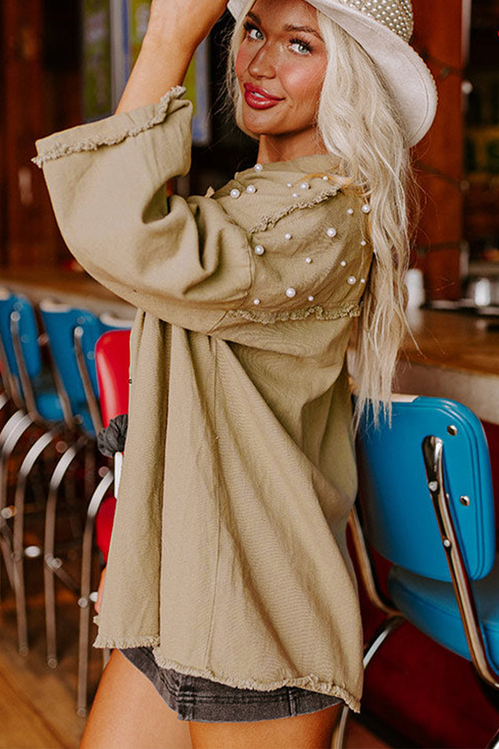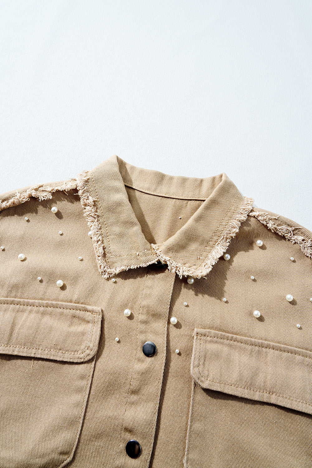 Khaki Pearl Beaded Raw Hem Button Up Denim Jacket