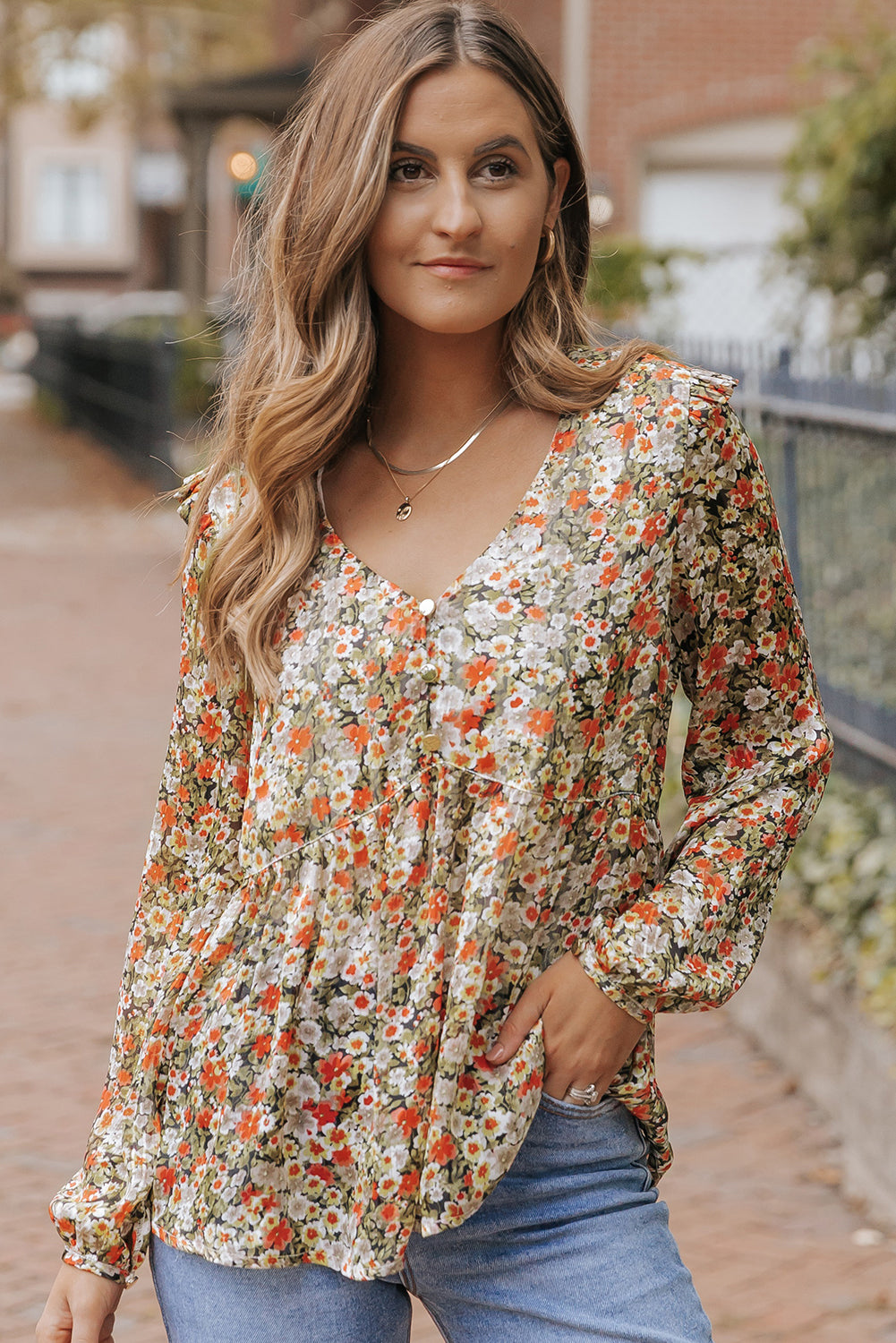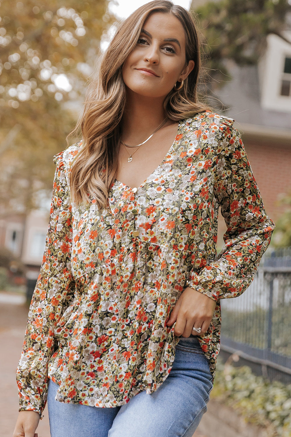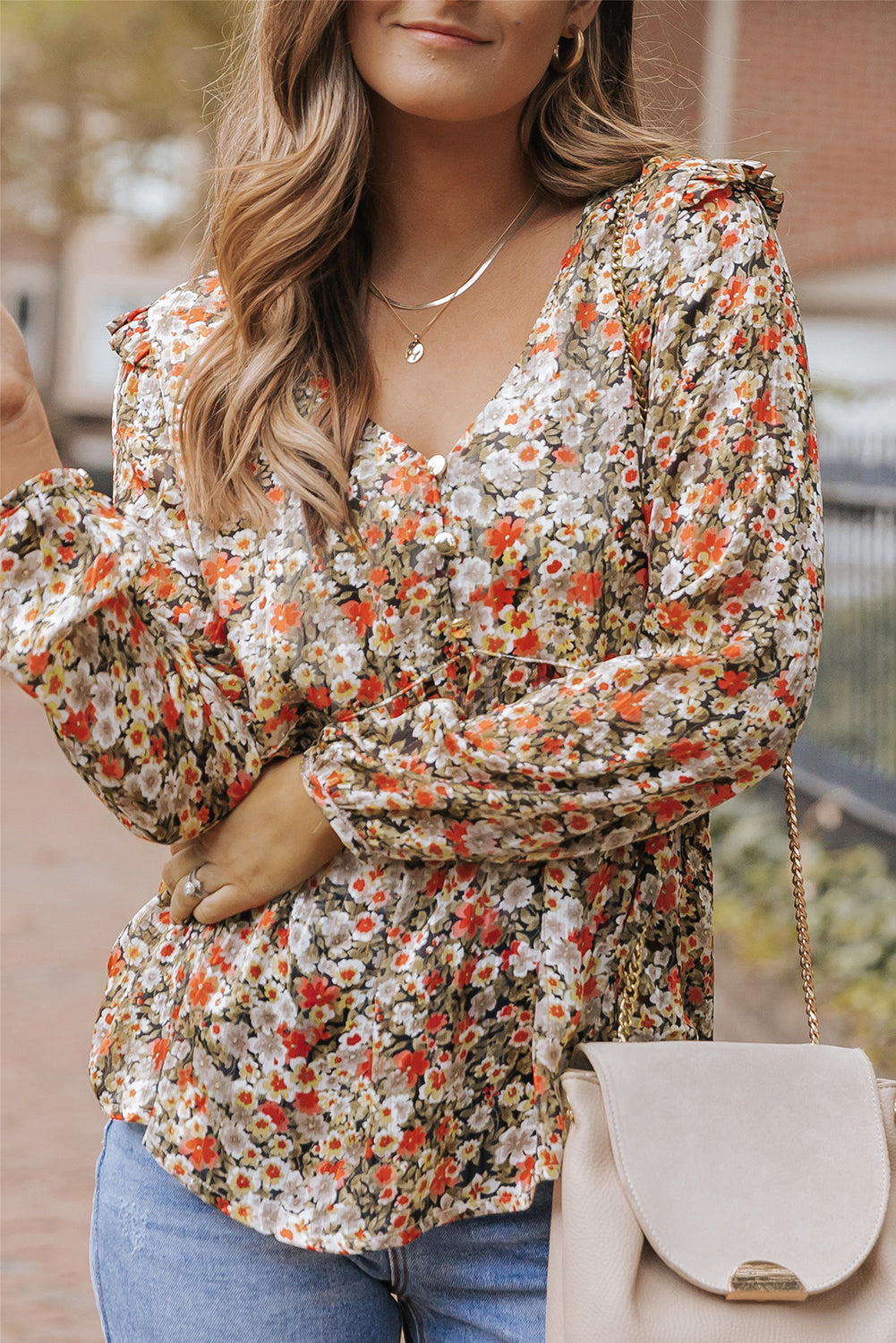 Khaki V Neck Ruffled Babydoll Floral Blouse