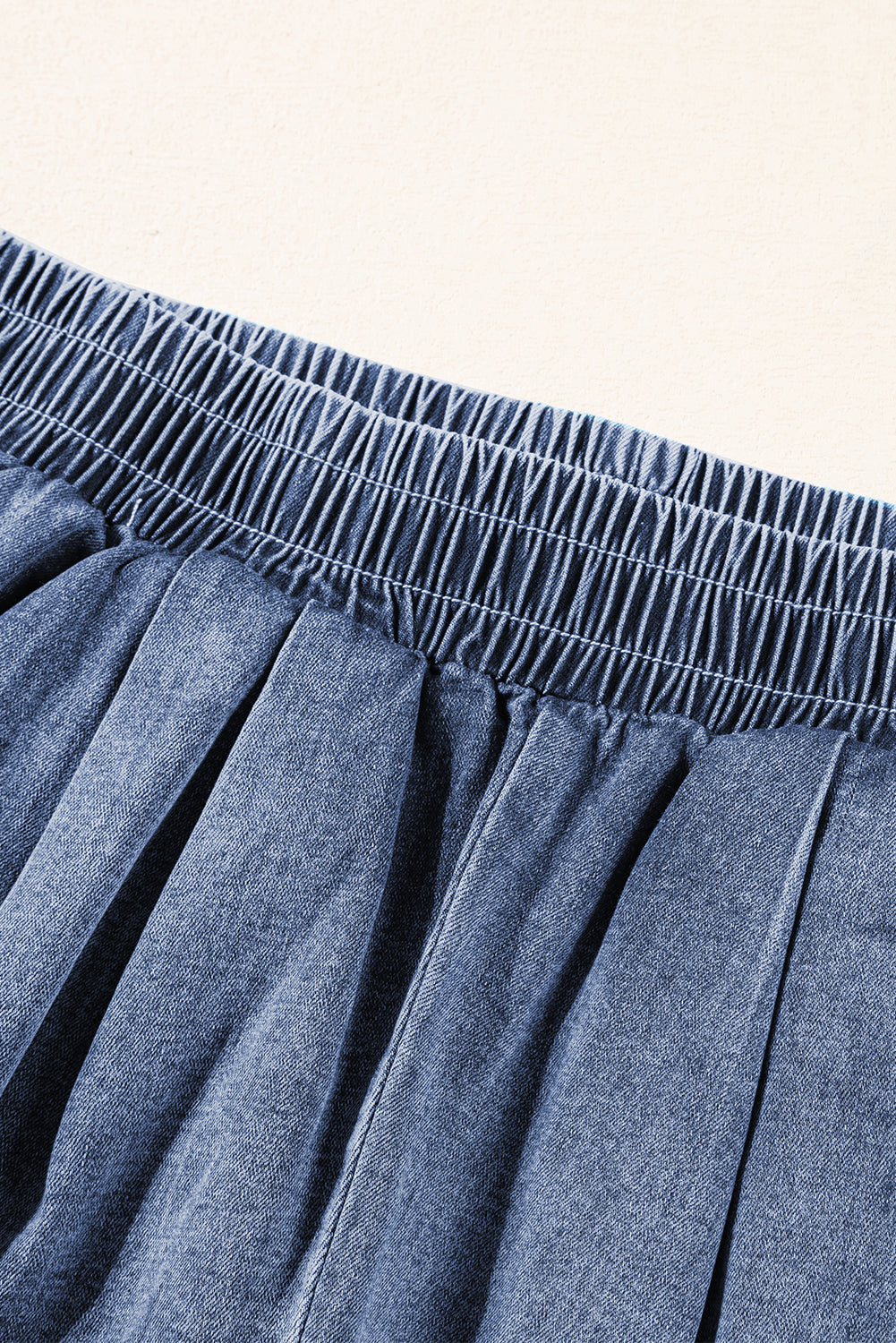 Light Blue Denim Cuffed Sleeve Tee Elastic Shorts Set