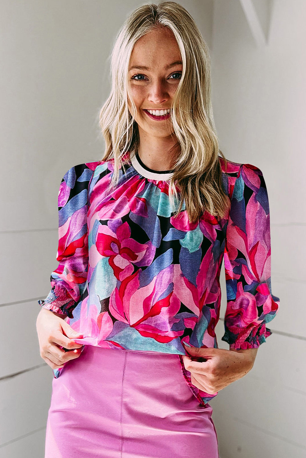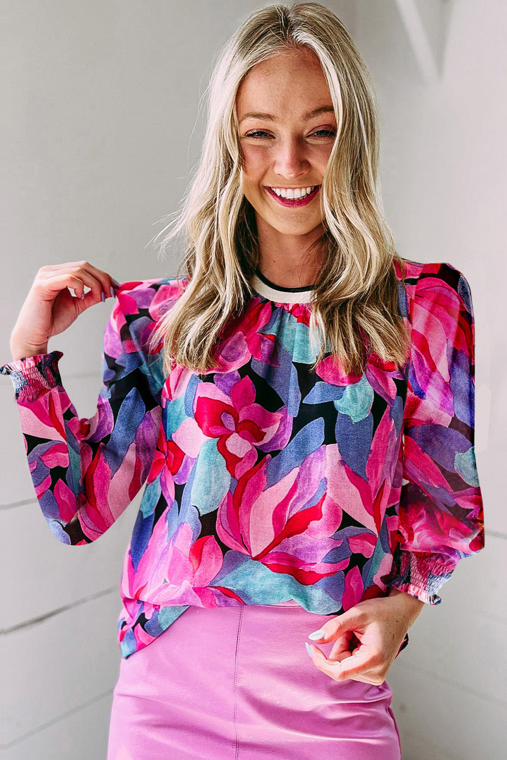 Multicolor Floral Print Ruched Sleeve Puff Sleeve Blouse