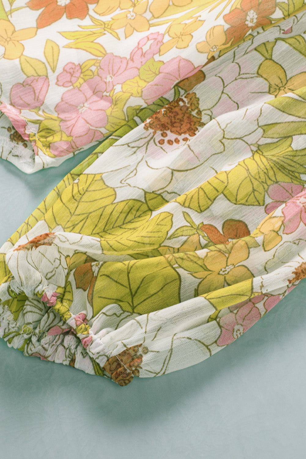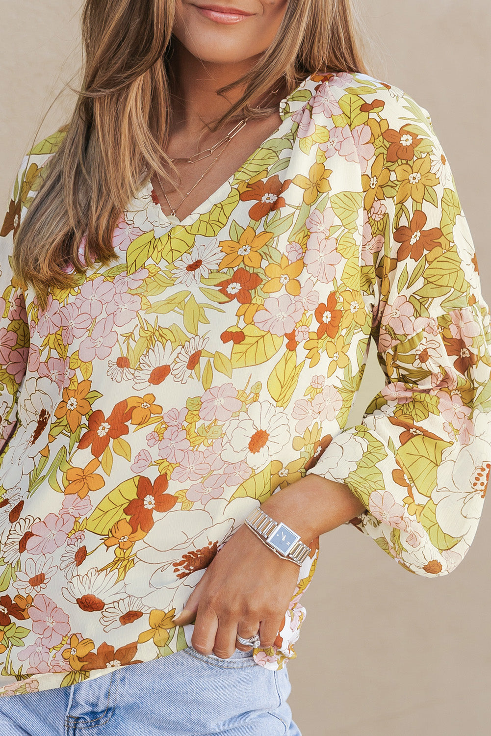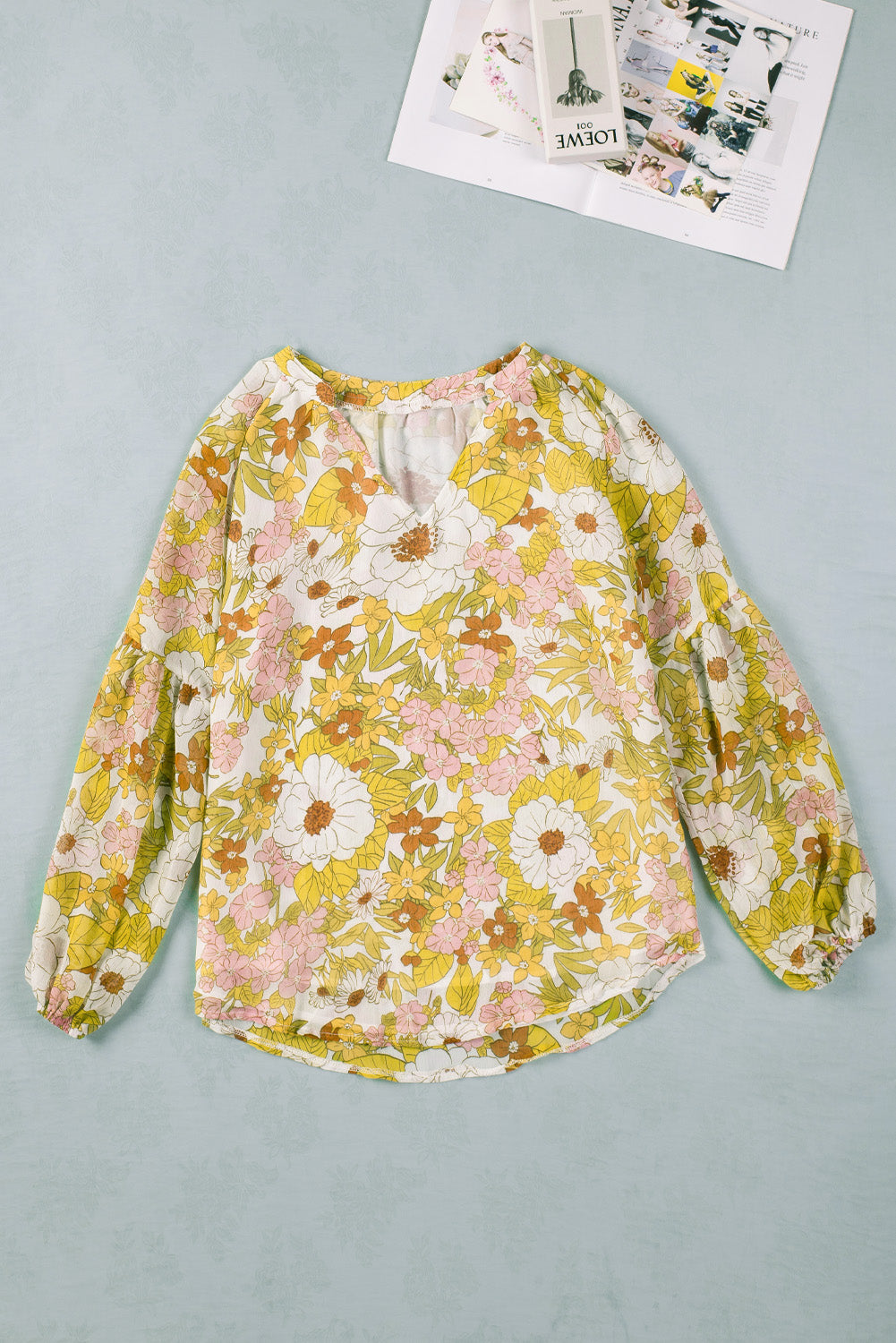 Multicolor Floral Print V Neck Long Puff Sleeve Top