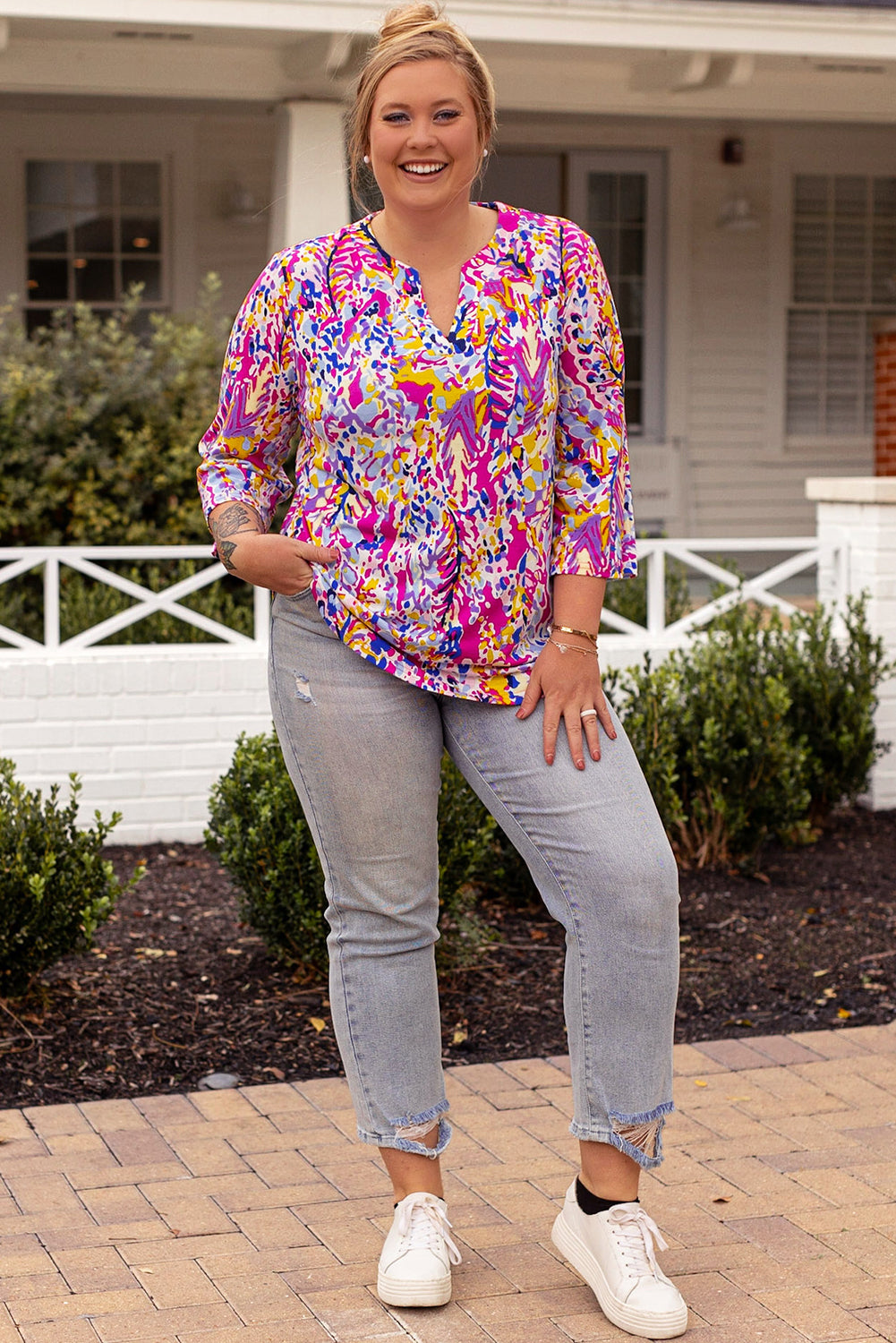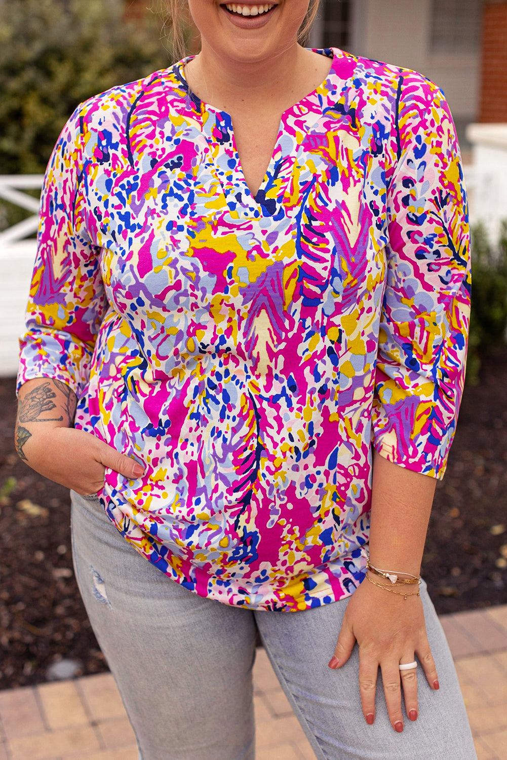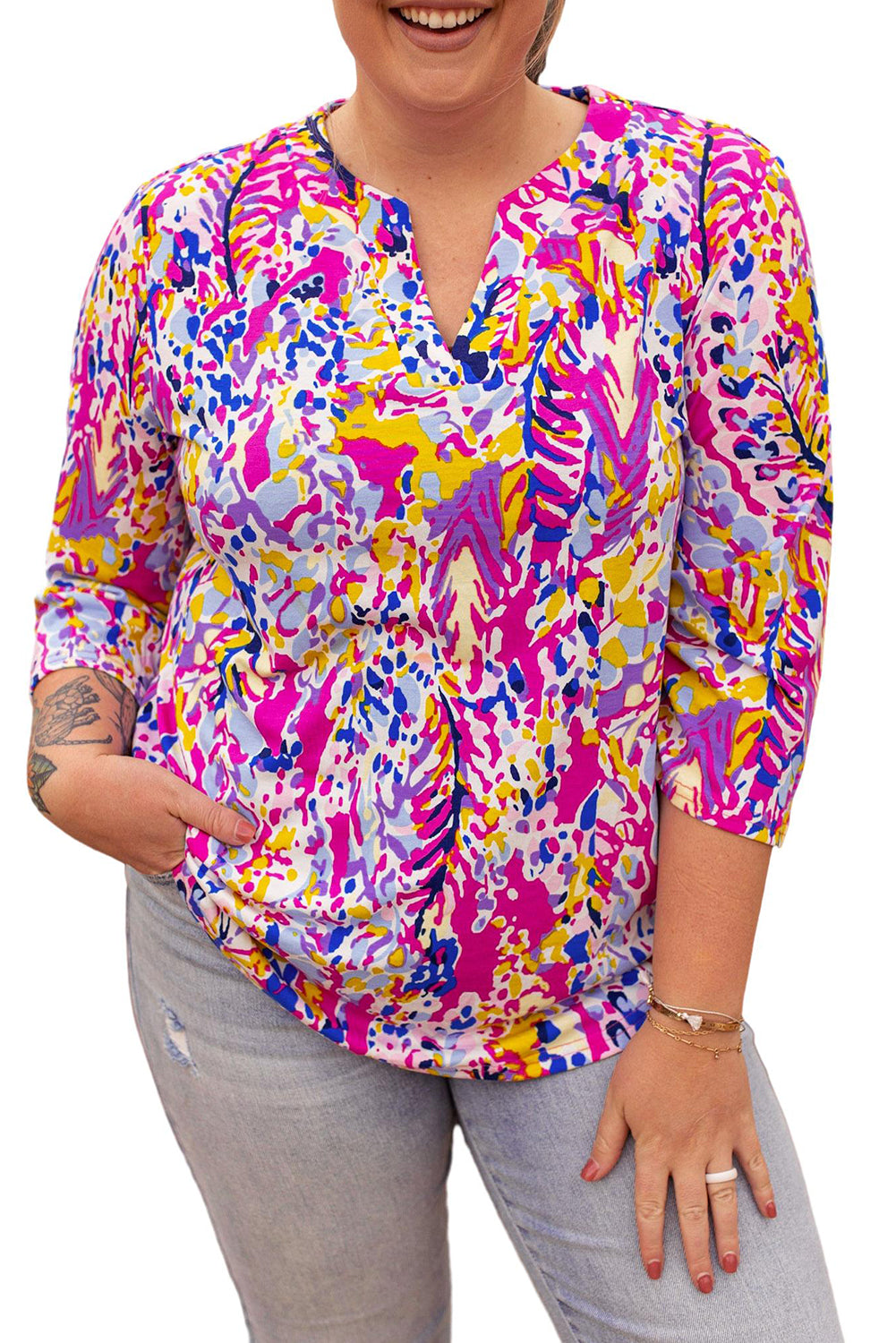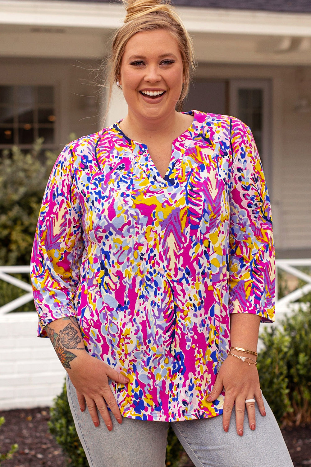 Multicolor Printed 3/4 Sleeve Split Neck Plus Size Tunic Top