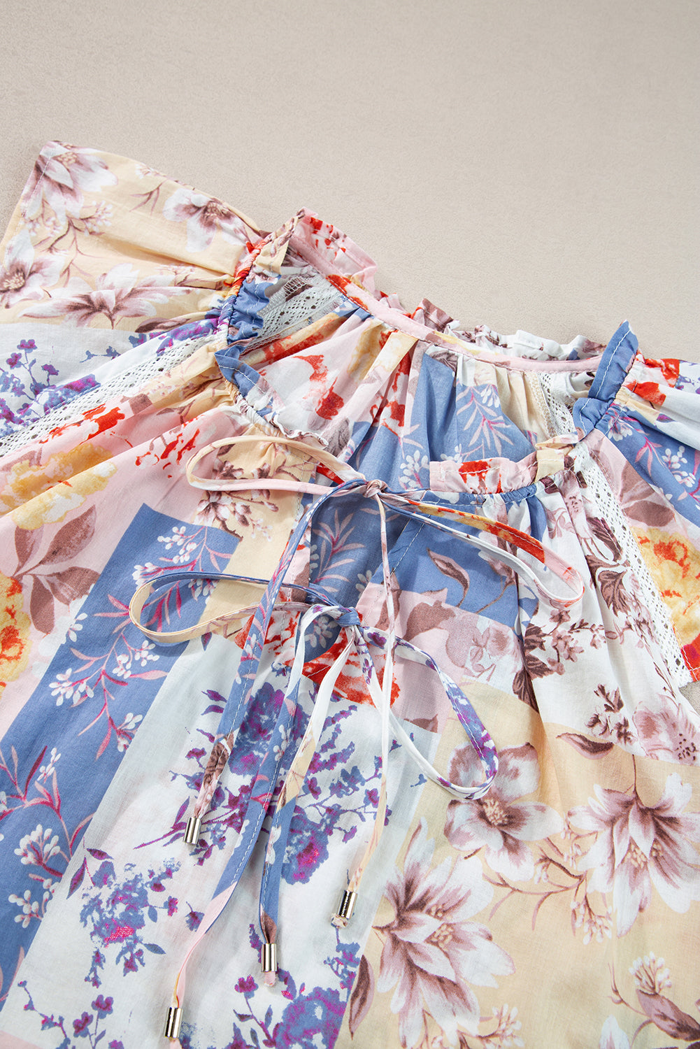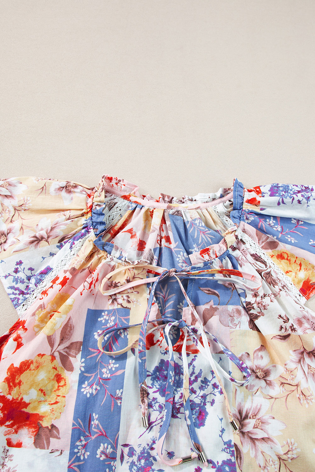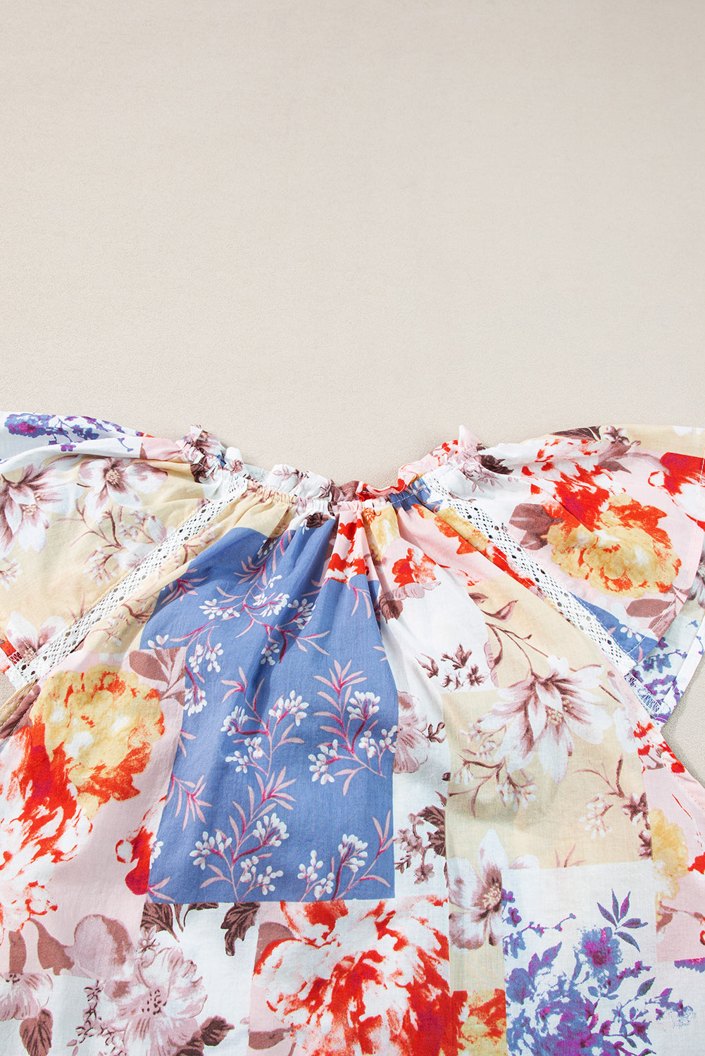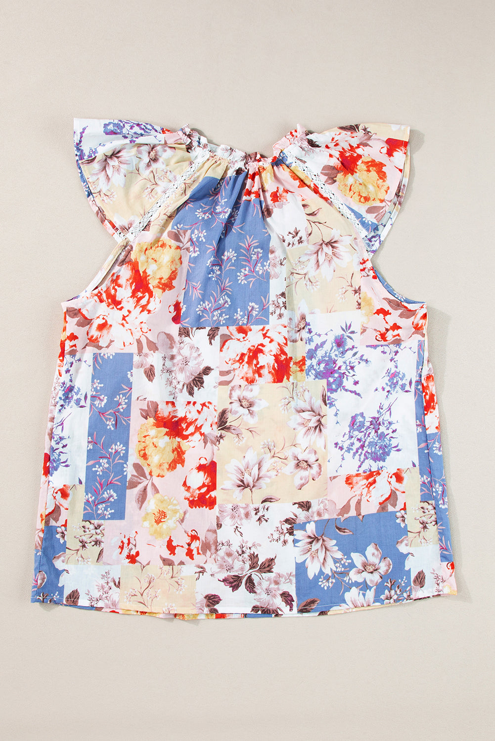 Multicolour Floral Print Split V Neck Lace Trim Cap Sleeve Blouse