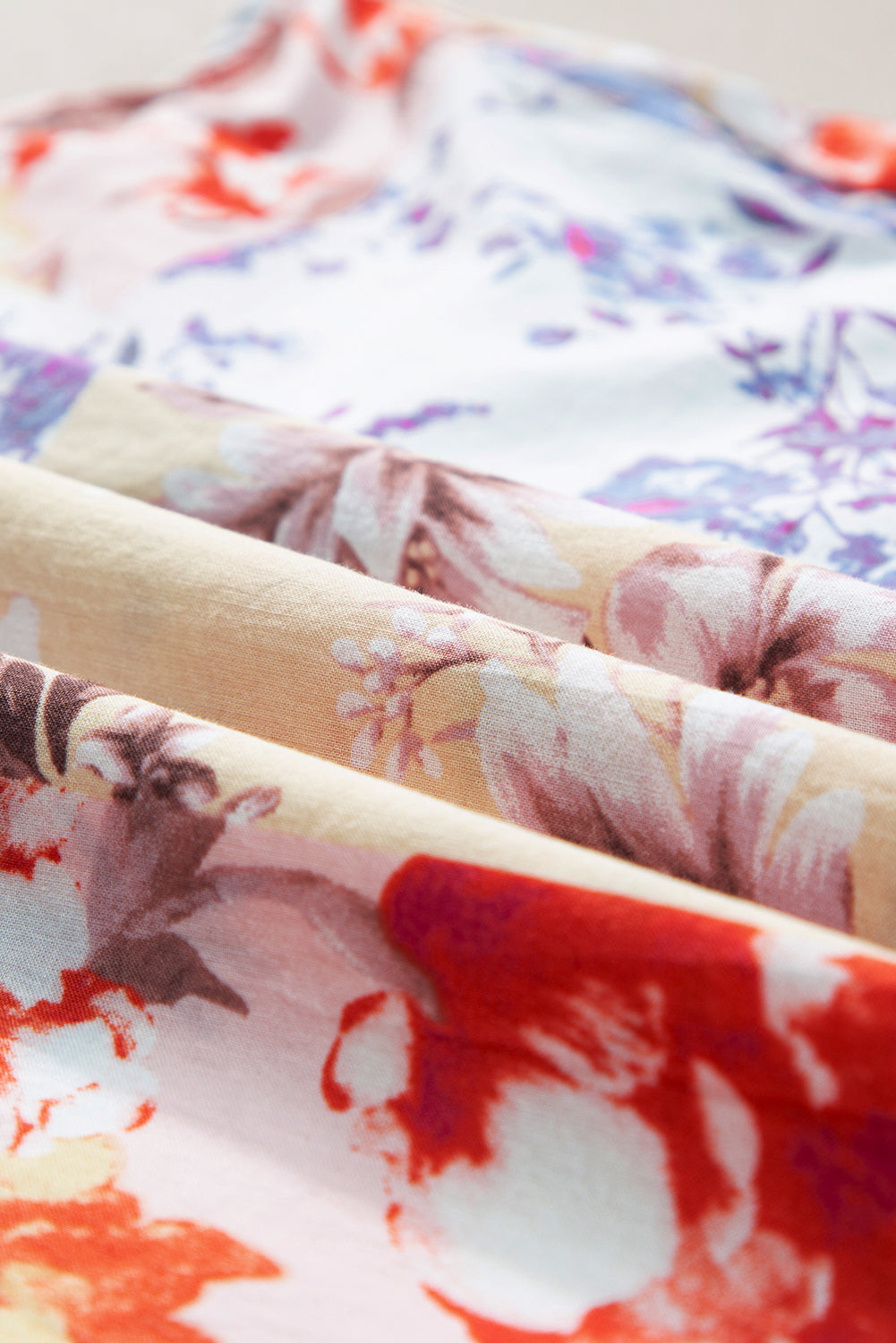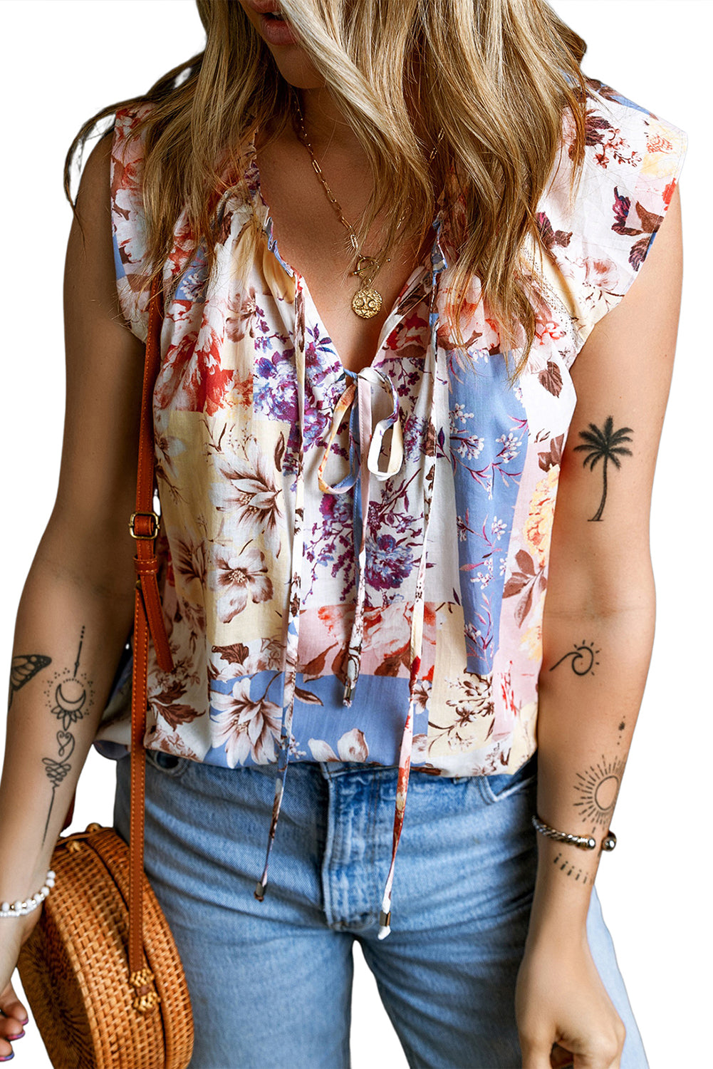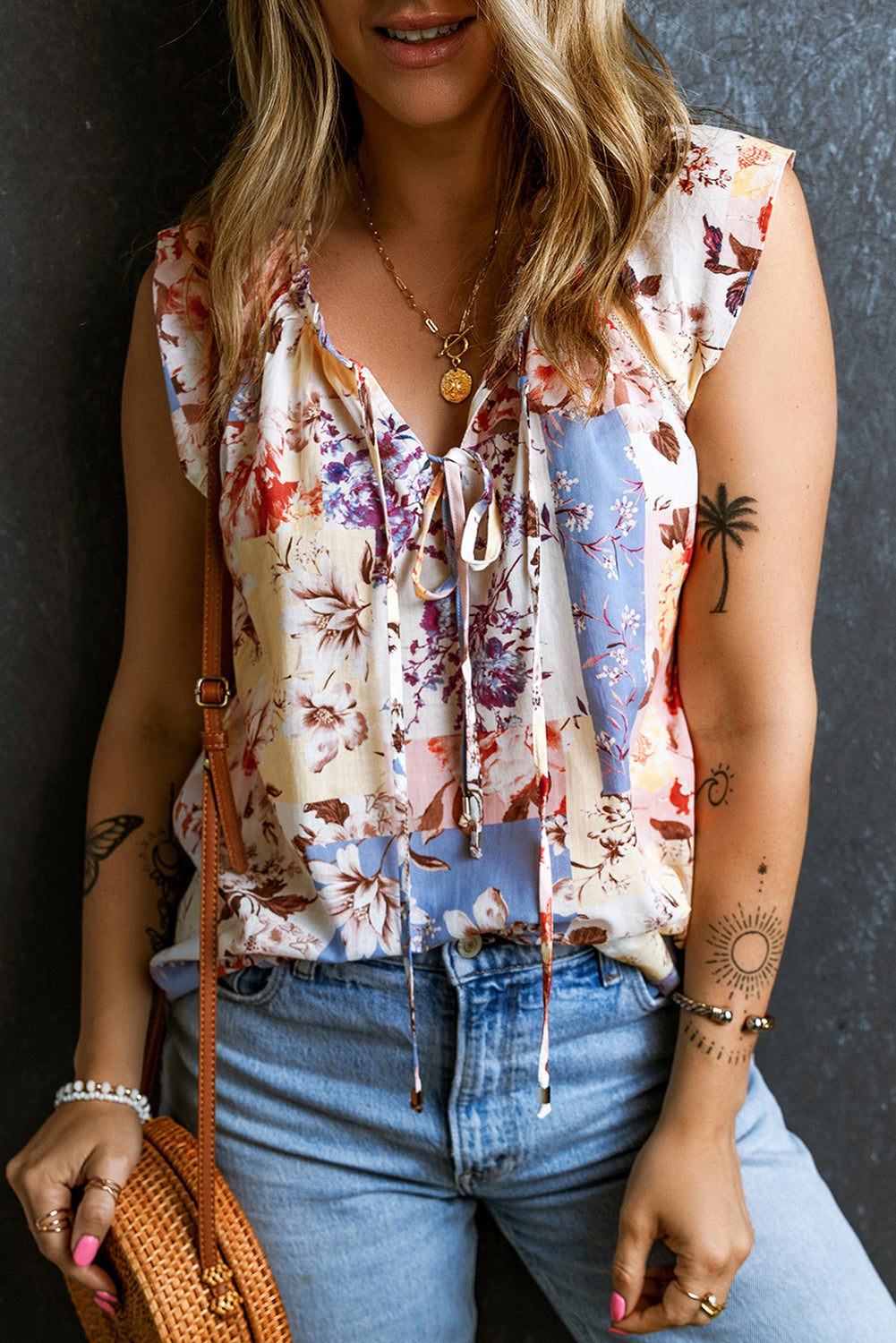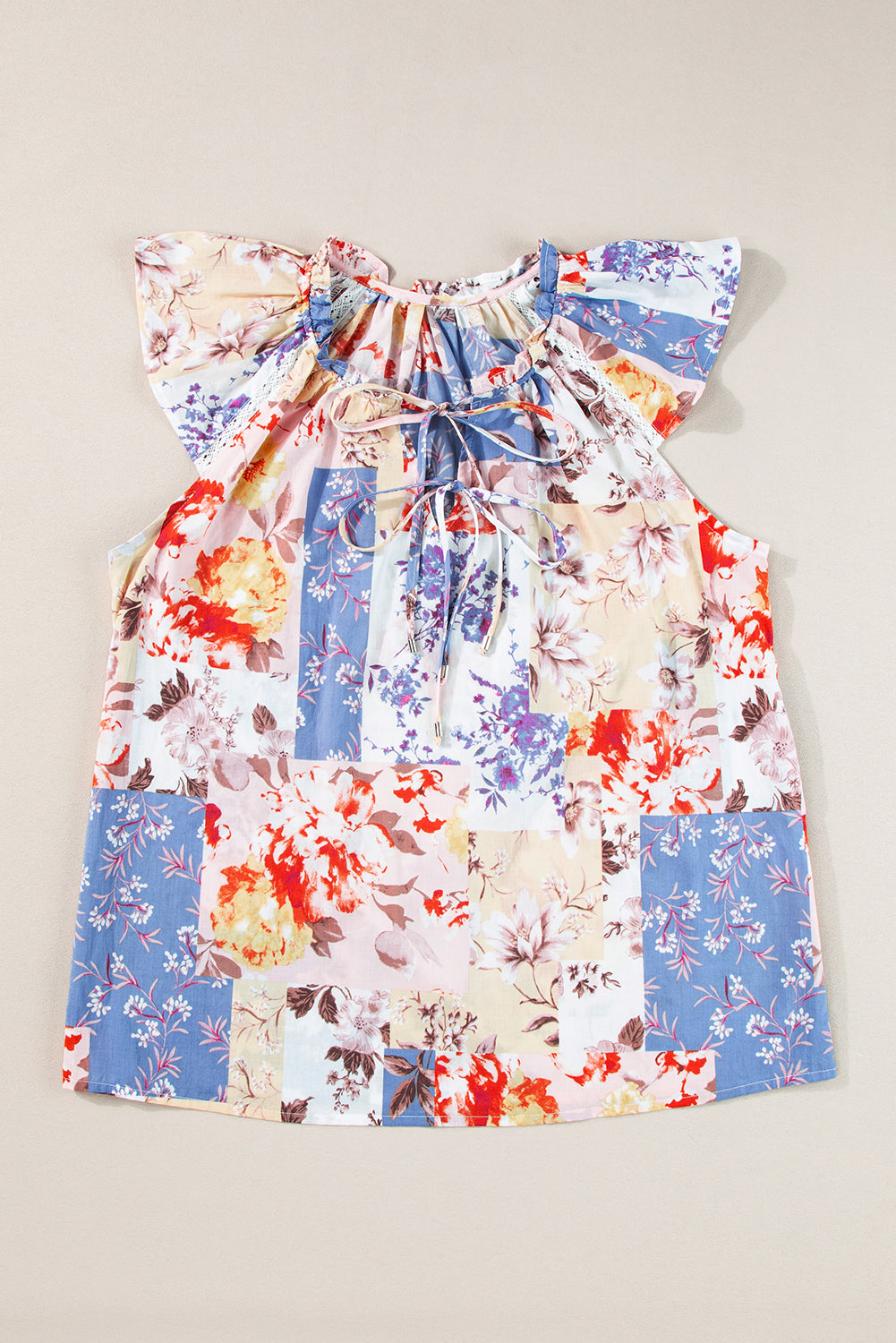 Multicolour Floral Print Split V Neck Lace Trim Cap Sleeve Blouse