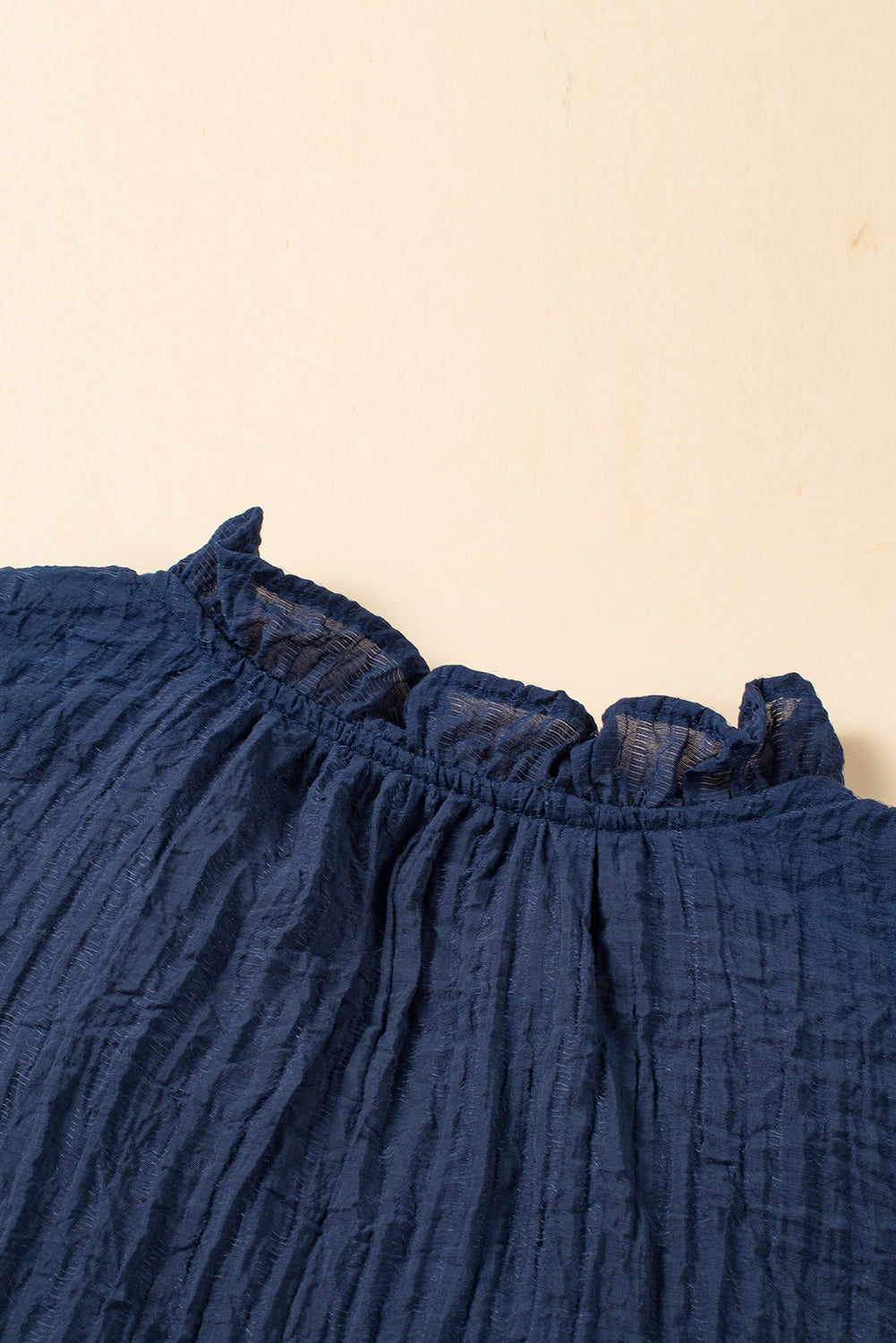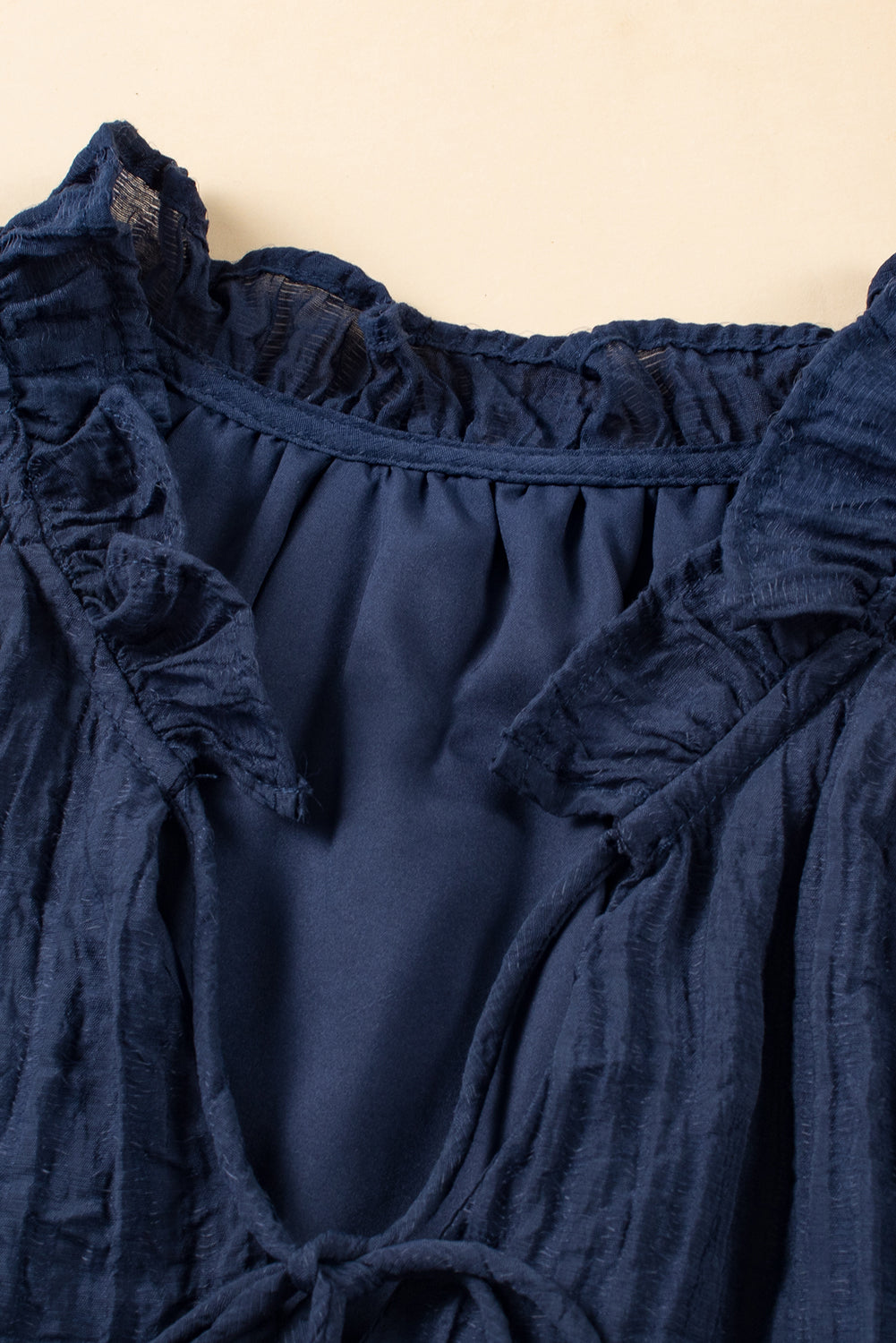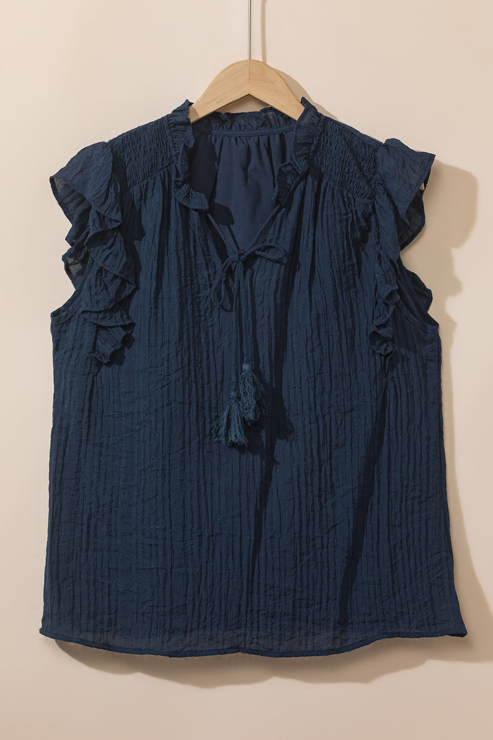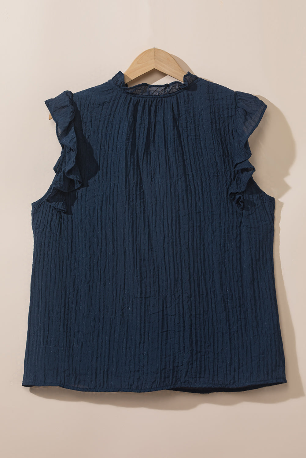 Navy Blue V Neck Flutter Sleeve Textured Blouse