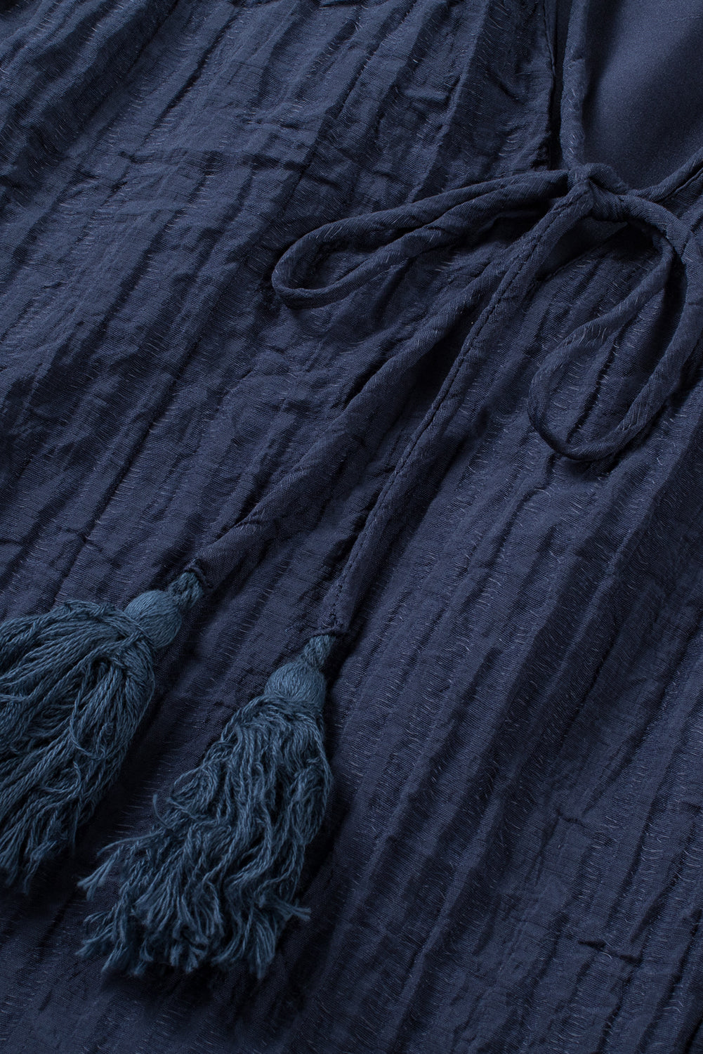 - Lightweight blouse with smocked shoulder detail and tasseled tie