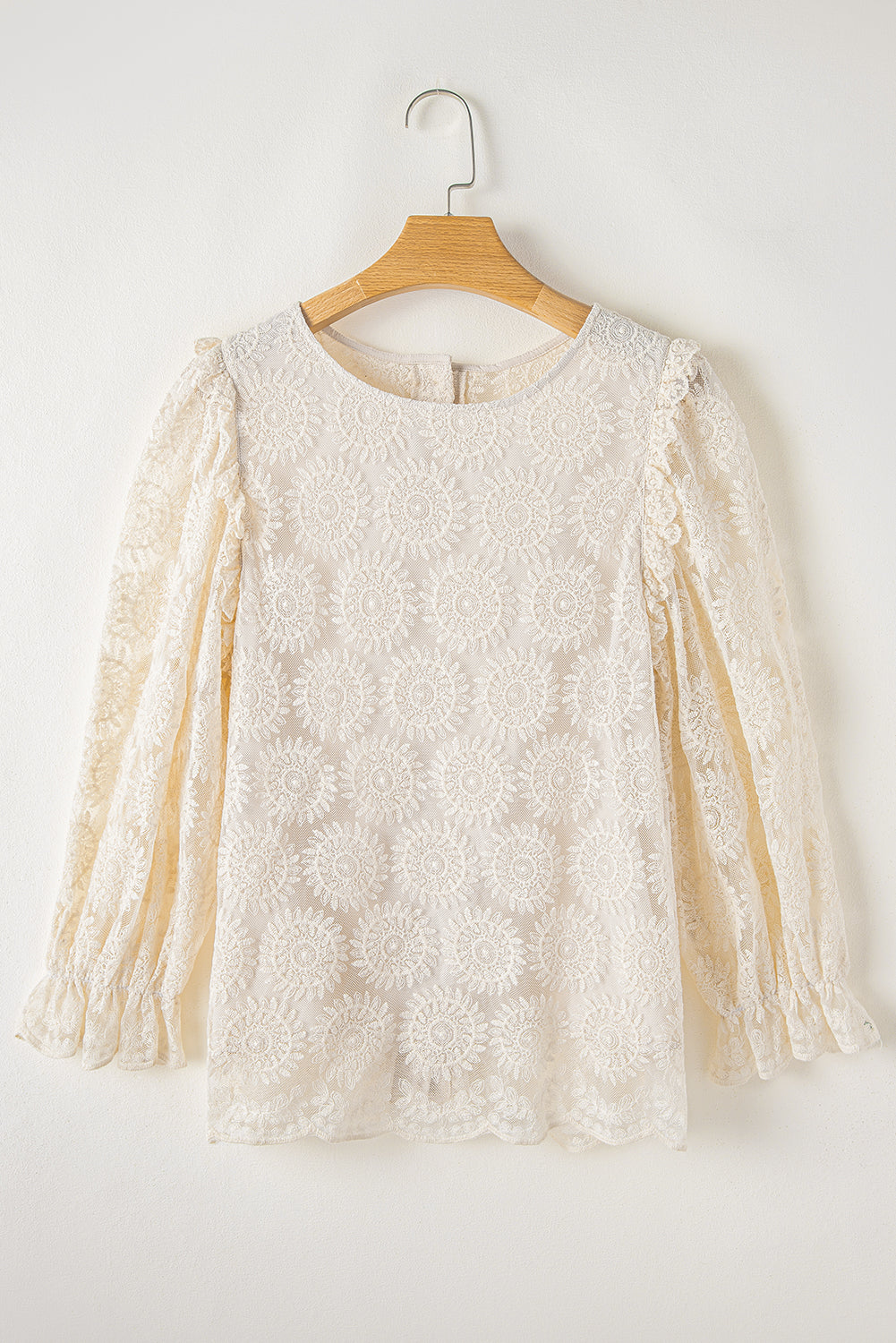 Oatmeal Flower Jacquard Button Back Ruffled 3/4 Sleeve Blouse