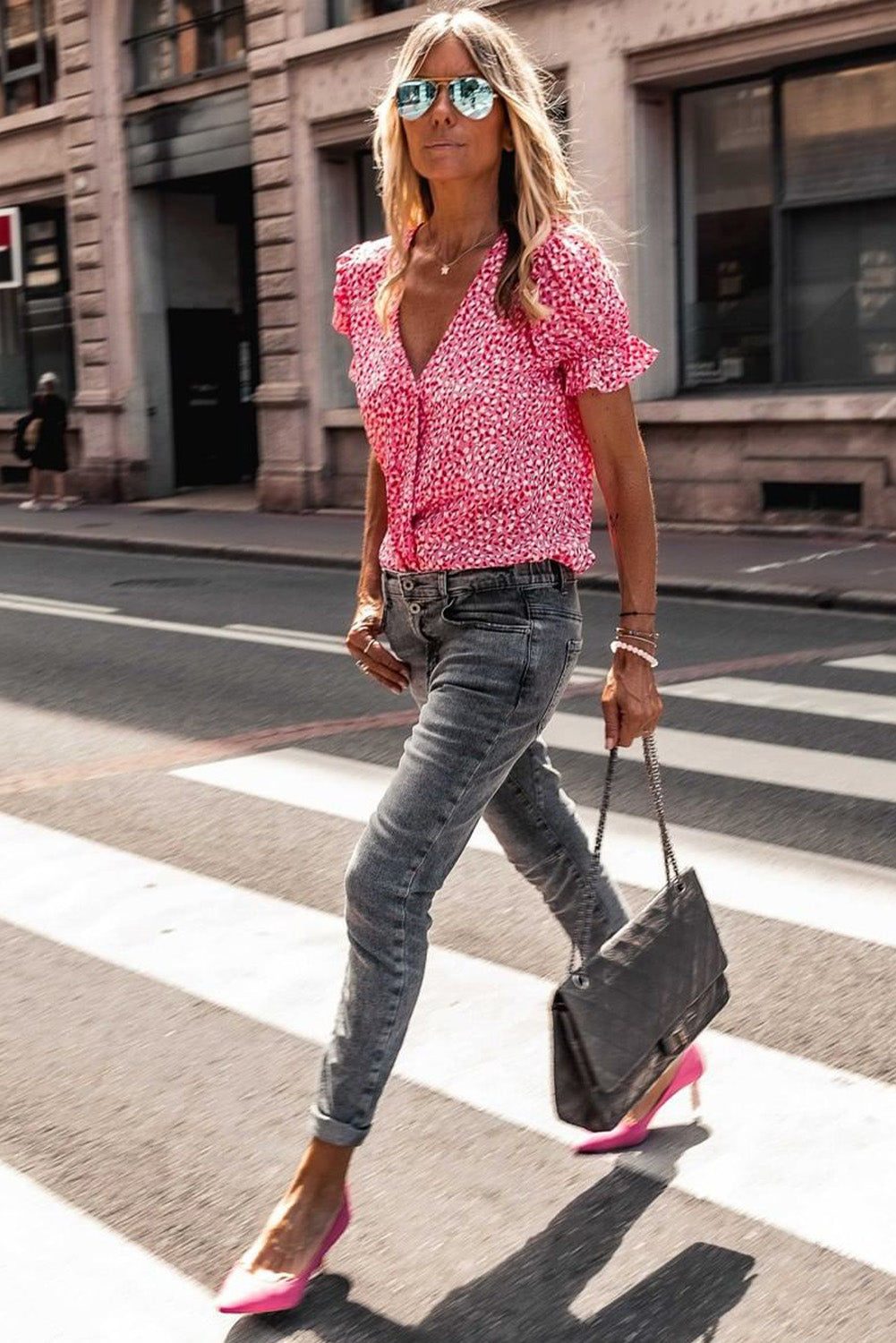 - This printed shirt adds a feminine and trendy touch to the overall design