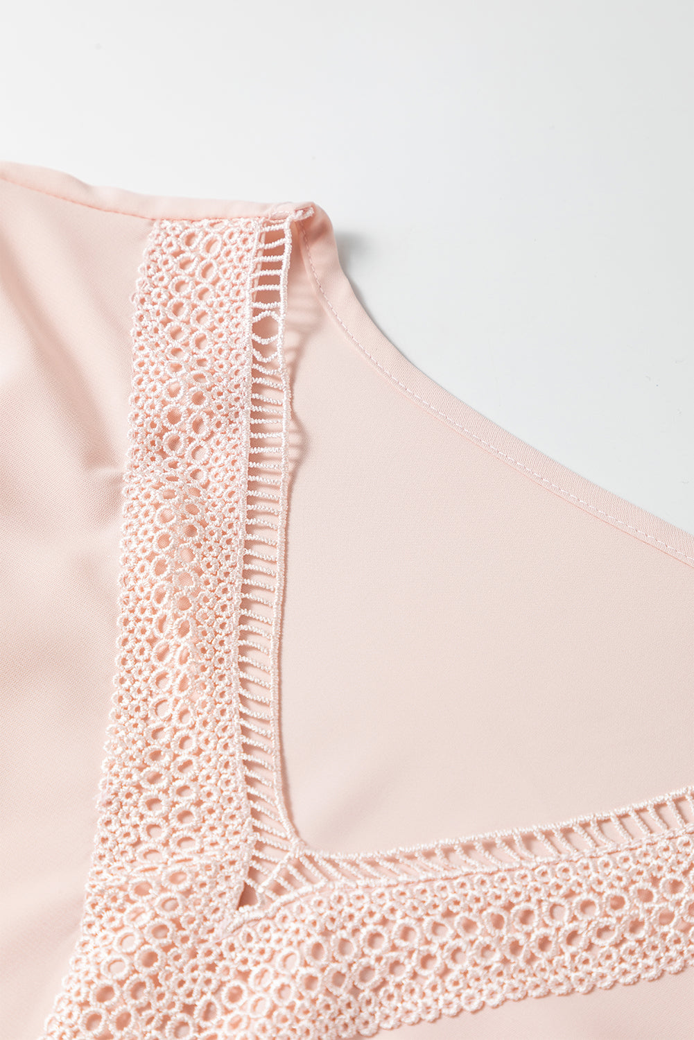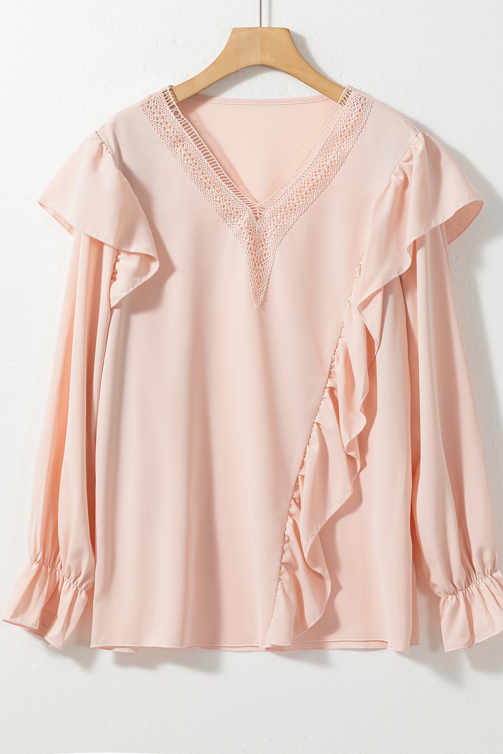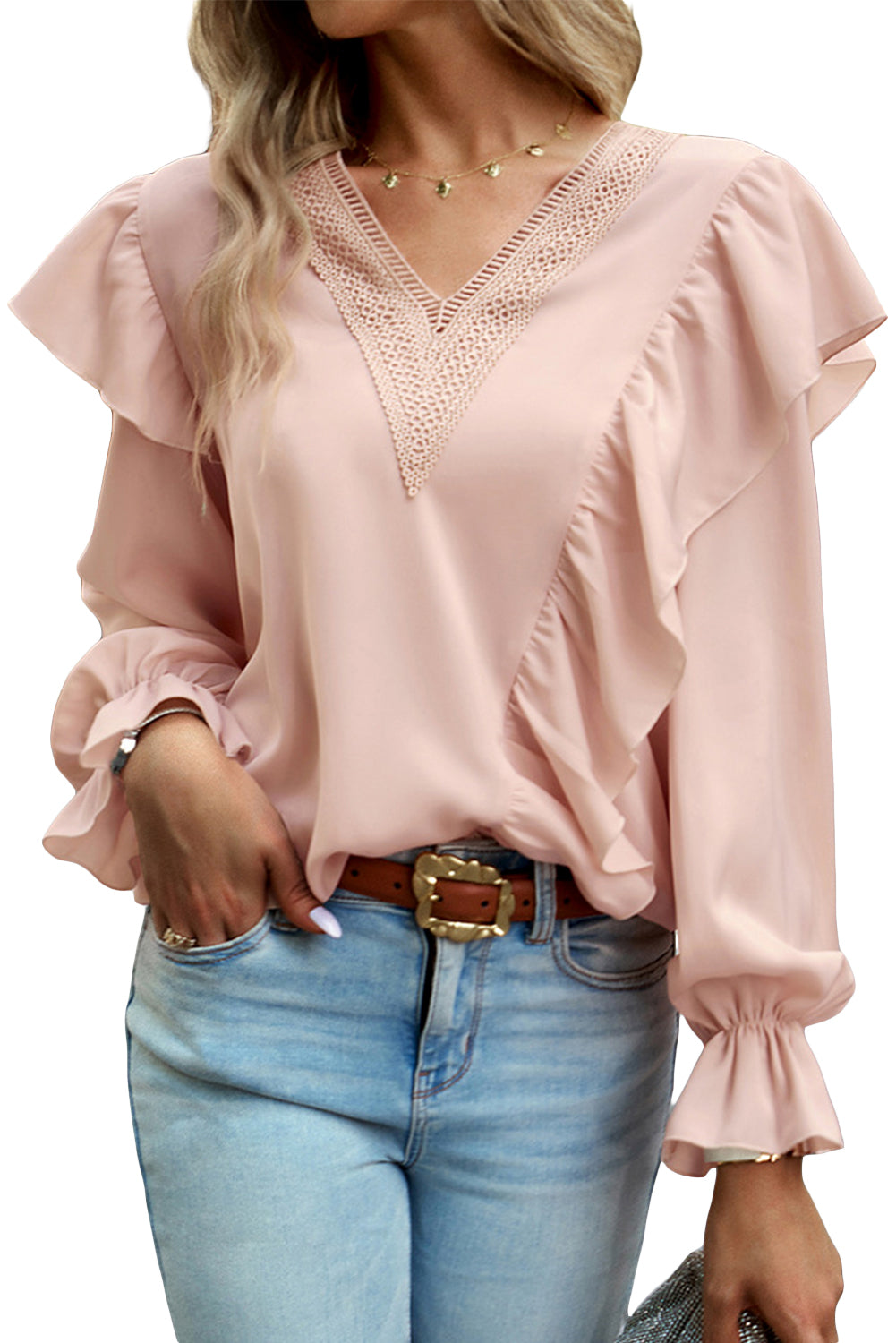 Pink Crochet V Neck Flounce Sleeve Ruffled Blouse