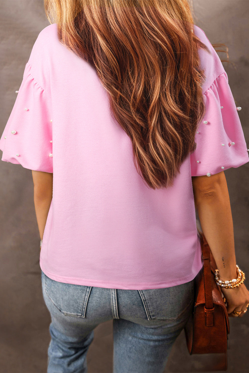 Stylish puff sleeves with pearl embellishments create a fashionable silhouette
