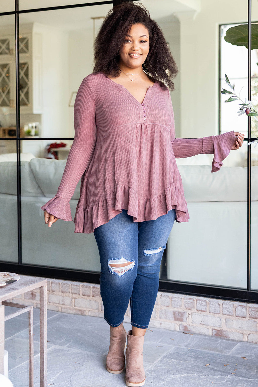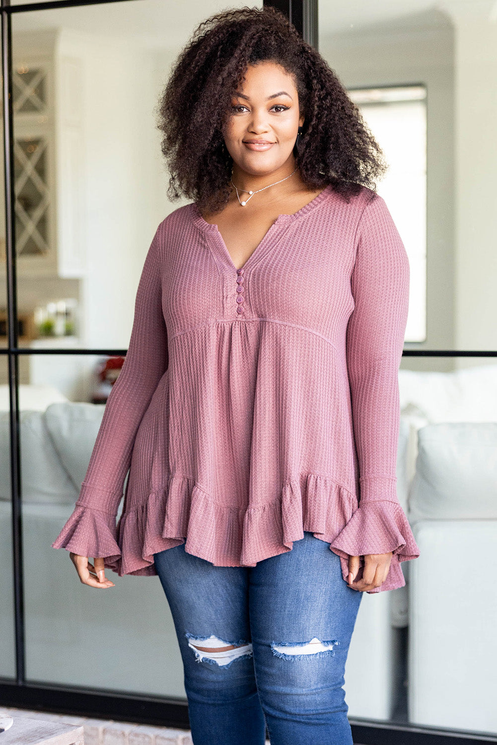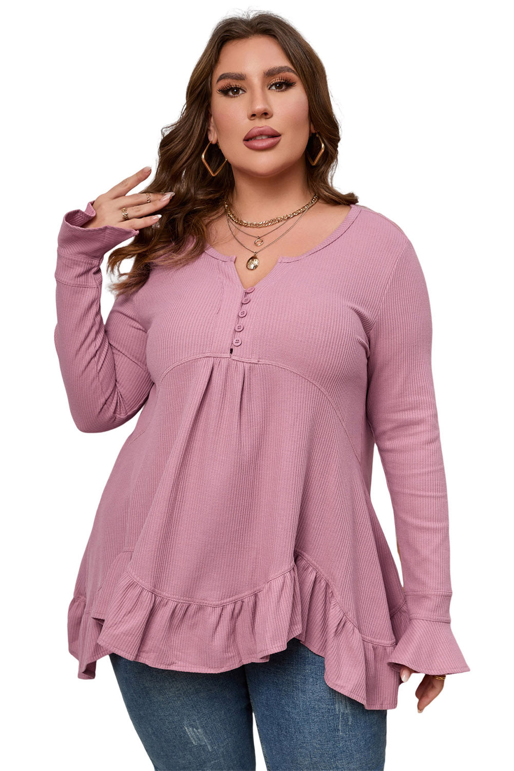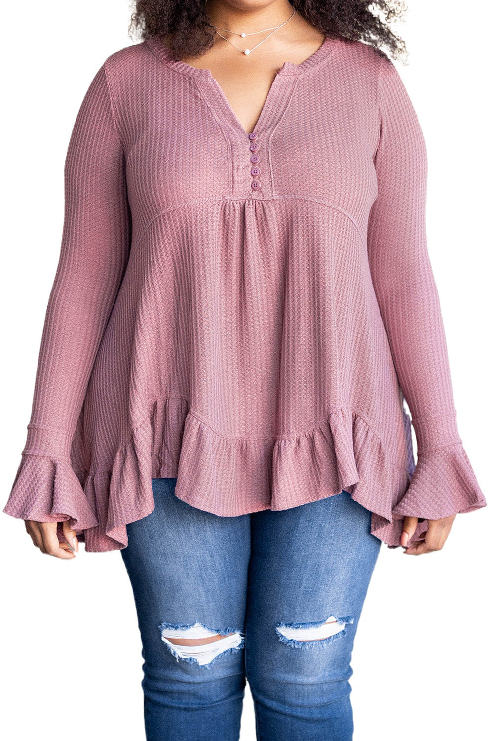 Pink Plus Size Ruffled Waffle Knit Babydoll Top