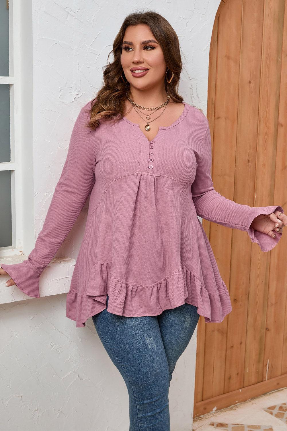- Featured with a v-neck with button, long sleeves, ruffles, and solid color